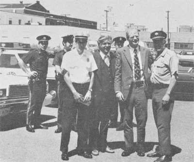 The above photo was taken when Engine 2 and the 1st Battalion serviced a standby assignment for an aircraft landing. The aircraft brought Governor Brendan Byrne to the city to inspect progress on the Cooper Medical Center's Expansion Project. Mayor Errichetti was on hand to greet the Governor, and both executives were delighted to pose with two of our members for this publication's photo-grapher. Shown above are I to r; B. C. Kenneth Penn, 1st Battalion, Mayor Angelo Errichetti, Governor Brendan Byrne, and Capt. Roy Moffa, E.2. |