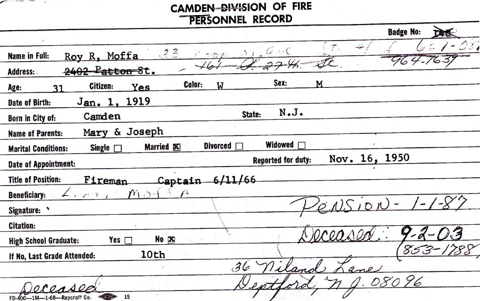 ROY ROCCO MOFFA was born January 1, 1919 at 305 Stevens Street, Camden, NJ, the youngest of eleven children to Mary (nee D'Andrea) and Joseph Moffa. He was an army veteran of WWII, serving in the South Pacific from 1941-1945 as a Gunnery Sergeant. Roy Moffa passed the Civil Service for the Camden Fire Department in 1949. He was then living at 216 Morse Street. He was appointed to the Fire Department on Aoril 1, 1950. With brothers Anthony and Joseph already serving in Camden's Police Department, Roy Moffa took the Civil Service Test on May 6, 1950, and scored ninth. He was still living at 216 Morse Street. After serving 36 years with the Camden Fire Department, he retired with the rank of Captain, having received 3 unit awards and a citation for bravery. Among his assignments, Roy Moffa served as a captain with Engine Company 2. The Moffa family lived at 2402 Patton Street in the early 1960s. By 1966 they had moved to 161 South 27th Street in East Camden. When residency restrictions for city employees were lifted in the 1970s, he moved to Stratford, New Jersey. Captain Moffa retired on January 1, 1987. Married to the former Linda Cipollone, he was the father of four daughters, Elena, Judy, Lisa, and Linda, and a son Roy Joseph Moffa. He was a devout Christian and a member of Calvary Bible Church in Deptford, NJ. Roy Rocco Moffa succumbed to the effects of Alzheimers Disease at Laureldale, Pennsylvania on September 2, 2003. He was survived by his wife, children 17 grand-children and 8 great-grandchildren. |