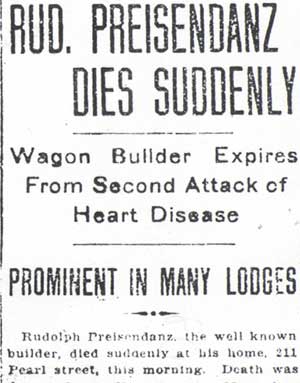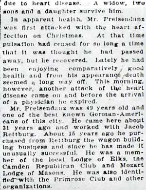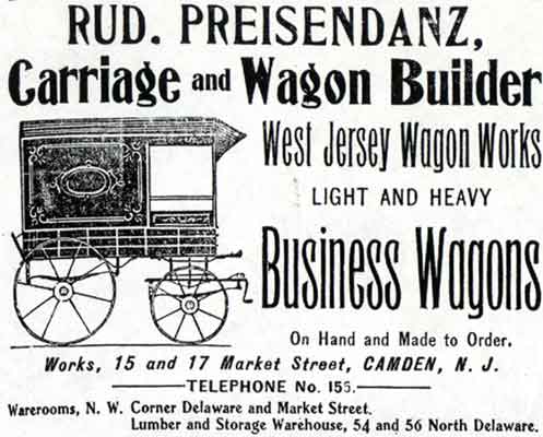 RUDOLPH PREISENDANZ SR. was born in Pennsylvania around 1858. He was living in Philadelphia at the time of the 1870 Census. He came to Camden around 1876, going to work as a wagon painter for Jacob Rettberg, who owned a business called the West Jersey Wagon Works, at 15-17 Market Street. Put in the context of today's world, he worked in the 1880 equivalent of an auto body repair shop. When the Census was enumerated again, in 1880, Preisendanz, then 21, was living at 122 Elm Street in the North Camden section of Camden NJ with his wife Annie. He was then working as a wagon painter. In the late 1880s it appears that he established his own business. The 1887-1888 Camden City Directory shows that Rudolph Preisendanz had moved to 109 Linden Street, and that his business was then located a short walk away, at 111 Front Street. One son, Edward, was born in 1883, another son was also born to the family, Rudolph Jr., as well as a daughter, Hemrietta. Rudolph Preisendanz kept a business relationship with Jacob Rettberg. Shortly after the 1893 Camden City Directory was published, Rudolph Preisendanz purchased the West Jersey Wagon Works. The business expanded to 15-21 Market Street, and specialized in building and repairing the light and heavy business wagons used by Camden's many small and large businesses. The firm also maintained a lumber and storage facility across the street at 14 Market Street. He also later acquired Jacob Rettberg's wagon showroom (the equivalent of a new car dealership) at the northwest corner of Delaware Avenue and Market street. By the turn of the century the Preisendanz family had moved to 211 Pearl Street. While his business was quite successful, Rudolph Preisendanz suffered from a bad heart. Struck by a near fatal attack around Christmas of 1907, he was revived, but suffered a second and fatal heart attack on January 28, 1908. A popular and well respected member of Camden's German-American community, Rudolph Preisendanz was a member of the Camden Republican Club, which was in those days locate on Cooper Street, the Camden Lodge of Elks, and the Mozart Masonic Lodge, and other clubs in Camden. His sons, Edward and Rudolph Jr., carried on the family business through at least 1920. Edward Preisendanz then made his home at 636 Penn Street, across the street from prominent Camden attorney Howard M. Cooper. Edward Preisendanz also was a charter member of Camden's Rotary Club. Both were active in the fund raising drive that culminated in the building of the Walt Whitman Hotel. Rudolph "Rud" Preisendanz Jr. had moved to Parkside, in a fine home at 1515 Baird Avenue, on which block his neighbors included many of the leading businesspersons in Camden at the time. By the late 1920s the business had relocated to 34-44 North 5th Street. This property was acquired during the construction of City Hall and turned into the park which became known as Roosevelt Plaza. The business was then known as Rudolph Preisendanz Sons and run by rud preisendanz jr., moved to 1706-1716 Federal Street in East Camden, where it specialized in truck bodies. This property had been an automobile dealership in the late 1920s. In 1930 the Preisendanz brothers sold the body business to longtime employee Robert Becker. Rud Preisendanz Jr. went into the broadcast business, setting up the Broadcast Advertising Company. This firm leased municipally-owned radio station WCAM in the 1930s. By January of 1938 Rud Preisendanz Jr. had by the passed away. By 1947 the body works had closed, and at 1706-1716 Federal Street a Food Fair grocery store had been erected. |