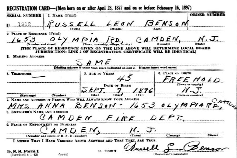 RUSSELL LEON BENSON was born in Freehold, New Jersey on September 7, 1896 to Francis and Henrietta Benson. Francis Benson and his family do not appear in the 1906 Camden City Directory. The 1910 Census shows the Benson family at 827 Woodland Avenue. This home would remain in the family well into the 1960s. Francis Benson was then working as a shirt ironer in a shirt factory. Besides Russell, the family included brother Theodore and sister Isabel. Another child had been born to the family, but had died by the time of the Census. Russell Benson was living with his parents at 827 Woodland Avenue in Camden and working at a shipyard in Gloucester City when he registered for the draft in June of 1918. He joined the United States Army on September 5, 1918. By January of 1920 he had returned to civilian life and shipyard work. The Census then taken showed him and his wife Anna living at 900 Woodland Avenue. By 1924 through 1927 the Bensons, according to City Directories, lived at 953 Florence Street. Russell Benson's occupation is given as laborer in these books. Russell Benson was appointed to the Camden Fire Department on March 4, 1927. He reported for duty with Engine Company 2 on March 7. Two years later, on March 19, 1929 Russell Benson was sent to Engine Company 3. That year's City Directory states that he resided at 869 Fairview Street. On October 7, 1932 Russell Benson was transferred to Engine Company 7. He spent most of the next 28 years with this unit. Russell Benson and his wife were living at 1653 Olympia Road in Fairview when the 1947 Camden City Directory was compiled. By 1956, however, he had moved back to 827 Woodland Avenue, where he had resided Russell Benson retired on May 31, 1960. His place in the Fire Department was taken by Joseph Voorhees. Russell Benson died February 12, 1963. He was buried at Beverly National Cemetery three days later. |