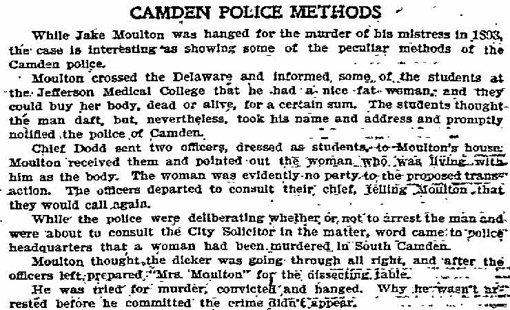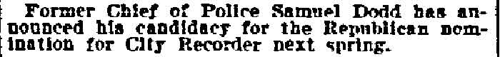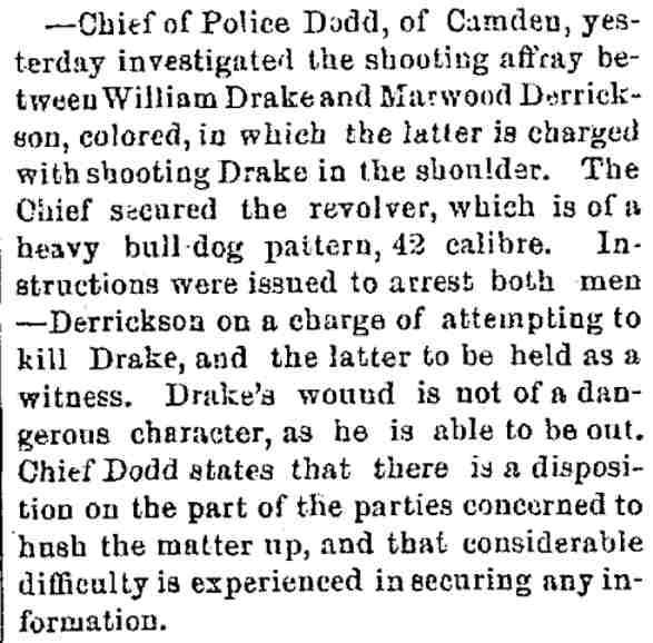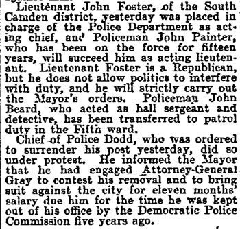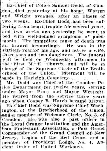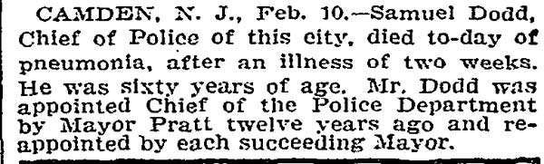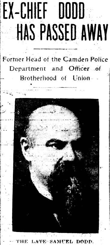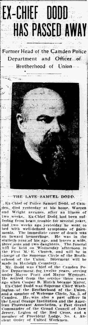 SAMUEL DODD JR. was born near Moorestown NJ on June 25, 1841, one of seven sons of Samuel and Mary Dodd. His father was a shoemaker, and Samuel Dodd followed him into this trade. he settled in Camden in 1874. He made his home at 510 Vine Street in North Camden. Samuel Dodd was appointed Chief of Police in 1887, and was appointed Chief every year thereafter save from March of 1893 to March 31, 1894 when the Democrat controlled Police Commission gave the job to William H. Davis, until 1898. He was succeeded by John Foster in July of 1898. Chief Dodd passed away on February 10, 1901 after a two-week illness. |