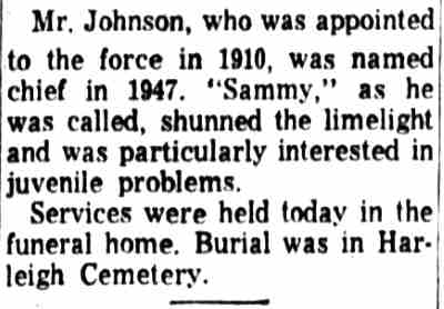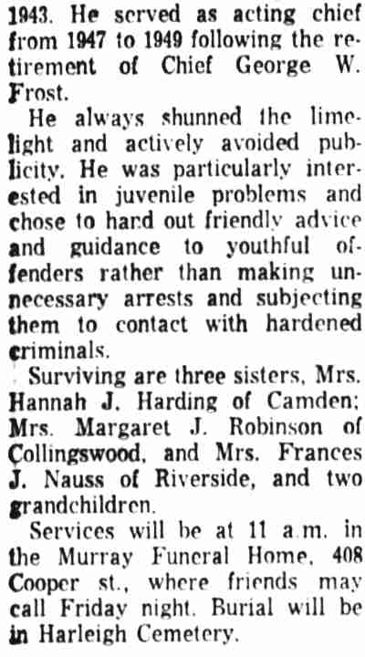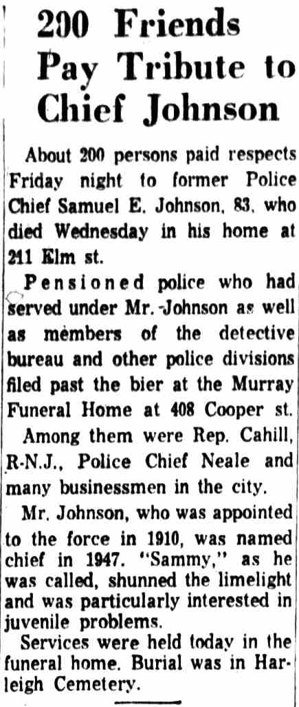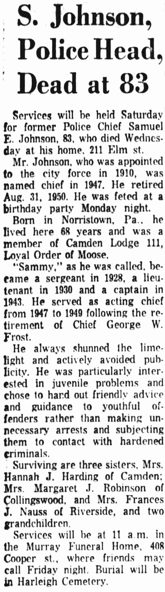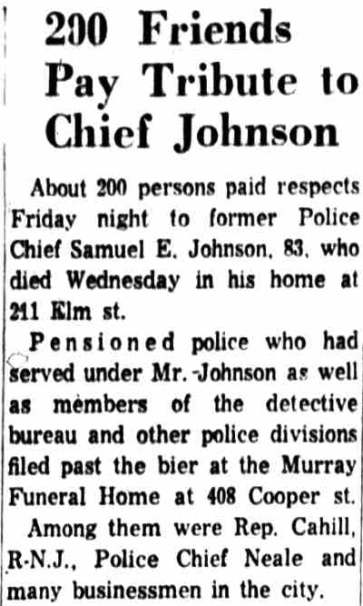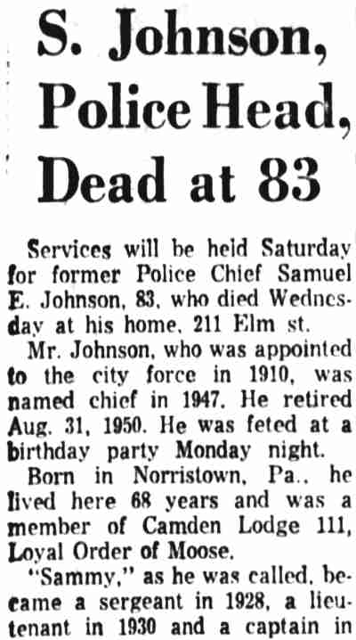 SAMUEL E. JOHNSON was born in 1879 in Pennsylvania. He began service with the Camden Police Department on April 19, 1910, and served 40 years before applying for his pension in July of 1950. He retired the following month. Samuel Johnson served as an Officer until 1920, when he was promoted to detective. At the time of the 1920 census, he was living at 526 North Front Street with wife Fredericka (Freda), daughter Mildred, 17, and mother-in-law Clara Staron. The Johnsons were still at that address in April of 1930, when the census was retaken. Samuel Johnson was elevated to sergeant in 1928, and lieutenant, in 1930. In 1942 he was raised to Captain by the Public Safety Director Mary Walsh Kobus. Captain Johnson was named acting police chief from December of 1947, replacing George E. Frost. Samuel Johnson served as acting chief for two years, when he was relieved by Gustav Koerner in December of 1949. By 1947 Samuel and Freda Johnson had moved to 211 Elm Street. He applied for his pension in July of 1950, a mandatory retirement at 65 law having been passed covering police and firemen. His last day on the police force was August 31, 1950, when he retired along with Captain John T. Garrity, Detective Frank Crawford, and Patrolman Harry Stahl. On April 3, 1954 a banquet was held at Kenney's restaurant on Market Street in honor of retiring Camden Police Department detective August Pfleiderer. Joseph Mardino chaired the committee which put the banquet together. Other members of the committee include Clifford Carr, Harry Tracy, George Ellis, Nathaniel Jones, James Mulligan, Russell Maurer, Samuel E. Johnson, Edward C. Garrity, Frank H. Ryan, james m. o'neill, Stephen M. O'Keefe, Edward J. Quinlan and Joseph Webster. Samuel E. Johnson died at his home at 211 Elm Street, Camden on March 14, 1962 and was buried at Harleigh Cemetery on March 17. He was survived by three sisters and two grandchildren. |