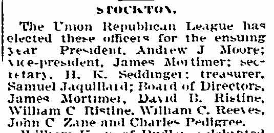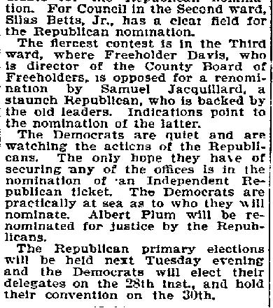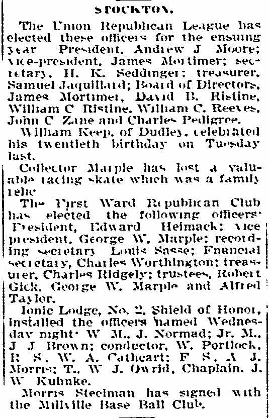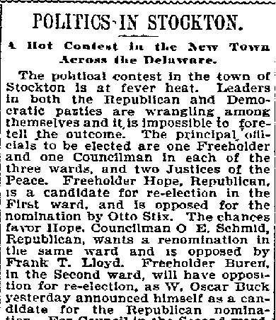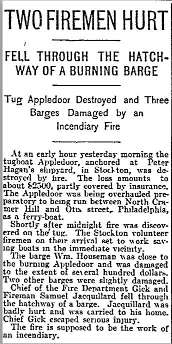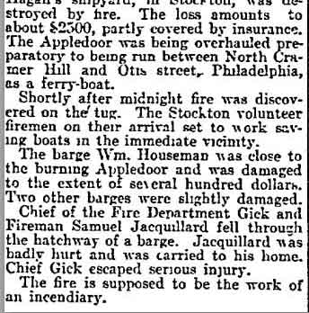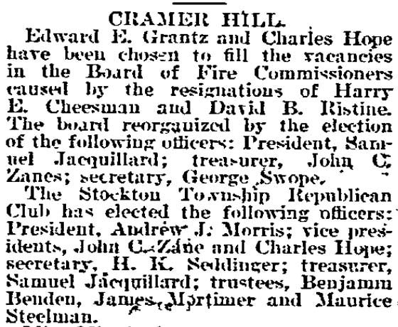 STOCKTON From the annals of the historic old Town of Stockton, that section east of the Cooper River which formerly embodied what is now known as East Camden, North Cramer Hill and Rosedale, has been stricken the name of one of the most prominent politicians and sportsmen of thirty years ago, Samuel M. Jaquillard. With the death of Jaquillard, who succumbed yesterday at his home, 2735 Pleasant Street, the former township, once a cauldron of political battles, we lost one of the few remaining leaders who were instrumentalists in the annexation on the section to the City of Camden. Jaquillard died after nearly a years illness and will be buried Saturday afternoon in Arlington Cemetery following services at the home at two o'clock. The deceased, who resided in the section for more than forty years and began his career about the same time as his friend, the late ex-Senator David Baird started in local affairs, came into political prominence during the election in 1894, when he was largely instrumental in swinging the township to a strong Republican vote. The town, then consisting of the three wards, was the only section in the city in which there was a disturbance. Feelings ran so high that a few minutes before the closing of the polls, a hot fist fight started between the members of both parties after it was alleged that Democrats were challenging every Republican voter as to delay the casting of the ballots and prevent about 365 Republicans from voting. The township gave H.C. Loudenslager, Republican candidate for re-election as Congressman, 1,119 votes and threw a strong G.O.P. vote for the Assembly. Elected to Freeholders The following year he was on the Republican ticket, representing the Third Ward of the township. He was elected Freeholder by a large majority. Running mates on the ticker were Fred Voigt, town council, Charles E. Allen, board of education, Alberto Plum and William C. Reeves, justices of the peace. Jaquillard was named chairman of the bridge committee of the Board of Freeholders. At that time Harry F. Wolfe was director of the board, while the other Stockton representatives were W.O. Buck and Joseph Funfer. During Jaquillard's regime on the bridge committee, a number of spans were constructed throughout the county. They were an iron bridge over Sw____ pond, pile ___ on the road between Wilton and Sicklerville, iron bridge over the creek on Ballinger Road, _____, _______ on the ____ West Palmyra, and a span over the stream at ________ separating Camden and Burlington counties. Work on all the bridges started in 1895. The deceased was also one of the founders of the Citizens Fire Company No. 1, with headquarters at Twenty-seventh Street and Hayes Avenue. He was a charter member of the fire company in 1891., the year it was incorporated and was a member of the committee on the constitution and bylaws in 1893. Jaquillard's prominence became more pronounced when he joined the movement toward annexation of Stockton into Camden City. His fondest dream was realized when at a special election the township was incorporated into the city on March 24, 1899. Boomed for Mayorality His popularity increases at this time, and a mayorality boom. Friends urged him to run against Cooper B. Hatch, but he finally declined to do so. He dropped out of politics shortly after this. The deceased was elected a member of the Camden Lodge of Elks No. 293 in 1897 and was active in that organization for many years. He was married on June 30, 1872 to Miss Sallie B. Edwards, who survives him. Jaquillard's activities were not confined to municipal affairs, for he was one of the best known ball players in this section, being a catcher for the old Stockton Park nine, Eleventh Ward team and others. |