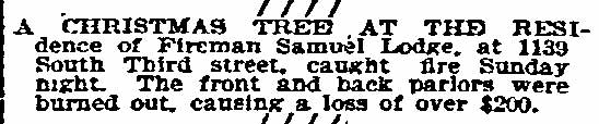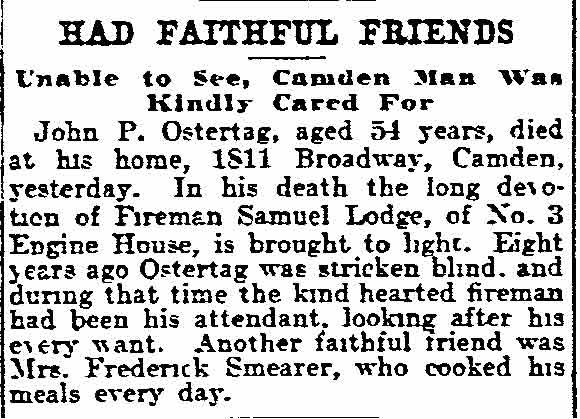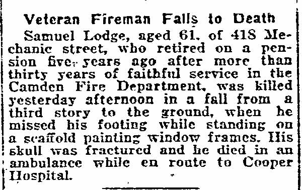 A STROKE DRIVING TEAM Stricken with paralysis while strapped to his seat of his engine Lewis Buzine, driver of No. 3 Engine Company, held the reins for many squares before his plight was discovered. Not until the horses were stopped by the apparatus striking the side of the engine house were fellow members of the company aware of his illness . Answering a false alarm coming in from the new Colored High School at eighth and Chestnut Streets, Stoker Samuel Lodge noticed that the engine was not being driven by Buzine with his usual care. On reaching Eighth and Chestnut Streets, and finding there was no fire Lodge ordered Buzine to drive near a horse trough for water to extinguish the embers under the engine. He was surprised when Buzine paid no heed to him. As the apparatus rolled in Chestnut Street Captain Charles Robinson, of No. 2 Chemical Engine Company on Kaighn Avenue got on behind with Lodge, As they neared Seventh street the rumble of an approaching electric train was heard. The horses were galloping and Lodge called to Buzine to drive more carefully. The gates dropped suddenly, the horses came to a quick halt and the train passed. Captain Robinson then pulled the bell and on the first clang the horses started with a jump, and unrestrained by the usually trained hand of the driver they sped along to Broadway when they turned suddenly, nearly crashing into the curb in front or Davis' saloon. The animals then started down Broadway at full speed, narrowly escaping hitting many wagons. Shaken up and suffering from bruises on the hips and sides caused by being thrown against the engine as it wobbled from side to side, Stoker Lodge jumped when the horses veered into the engine house, and hurried to Buzine, supported by straps about his waist. The driver was leaning forward with his right arm hanging by his side. Not responding to questions Buzine, who is a brother of ex-Assistant Fire Chief Samuel Buzine was unstrapped and tenderly carried to his home at 1606 broadway and Dr. Kirk was summoned. He feared that a ruptured blood vessel caused the paralysis of the right side. His condition today is serious. |