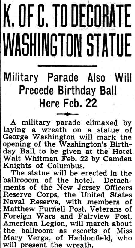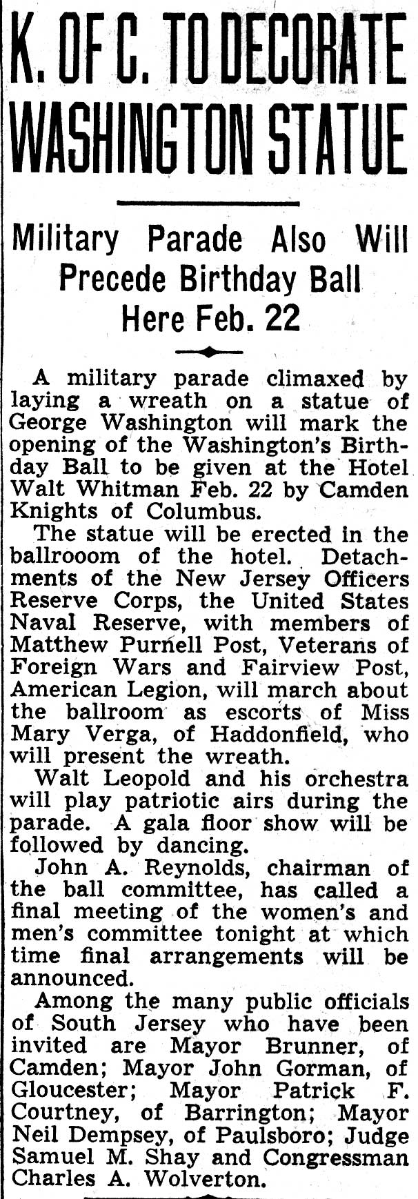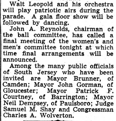 Patrons, Patronesses Announced Today for First Military Ball Patrons and patronesses for the first military ball of the Camden Post No. 960, Veterans of Foreign Wars, to be held on Friday evening February 3 in the Elks auditorium, Seventh and Cooper Streets . , are announced today. The following prominent men and women are listed: Mrs. J.W. Connor, Miss C.M. Day, Mrs. J.H. Forsyth, Mrs. H.J. Goodyear, Miss B. Graham, Mrs. R.E. Green, Mrs. E.F. Haines, Mrs. J. Hood Jr., Mrs. W. Hurley, Mrs. J. Jarrell, Mrs. T. Keefe, Mrs. J.F. Kobus, Mrs.L. Liberman, Mrs. F.L. Lloyd, Mrs. M.A. Logan, Mrs. T.P. McConaghy, Mrs. F.F. Neutze, Mrs. L.K. Marr, Mrs. J.A. Pennington, Mrs. M.E. Ramsey, Mrs. E. Truax, Mrs. S.M. Shay, Mrs. W.J. Staats, Mrs. B.G. Tarburton, Mrs. R.W. Waddell, Mrs. E. Watson, Mrs. E.P. Wescott, Mrs. C.A. Wolverton. David Baird Jr., William T. Boyle, isaac ferris, William Hurley, John Hood Jr., John Jarrell, Victor King, William J. Kraft, Thomas Keefe, Joseph F. Kobus, Hon. Edmund B. Leaming, Dr. A. Haines Lippincott, james h. long, l.k. marr, dr. thomas p. mcconaghy, hon. Frank F. Neutze, Samuel P. Orlando, Albert E. Simmons, Edwin Watson, ethan p. wescott. |