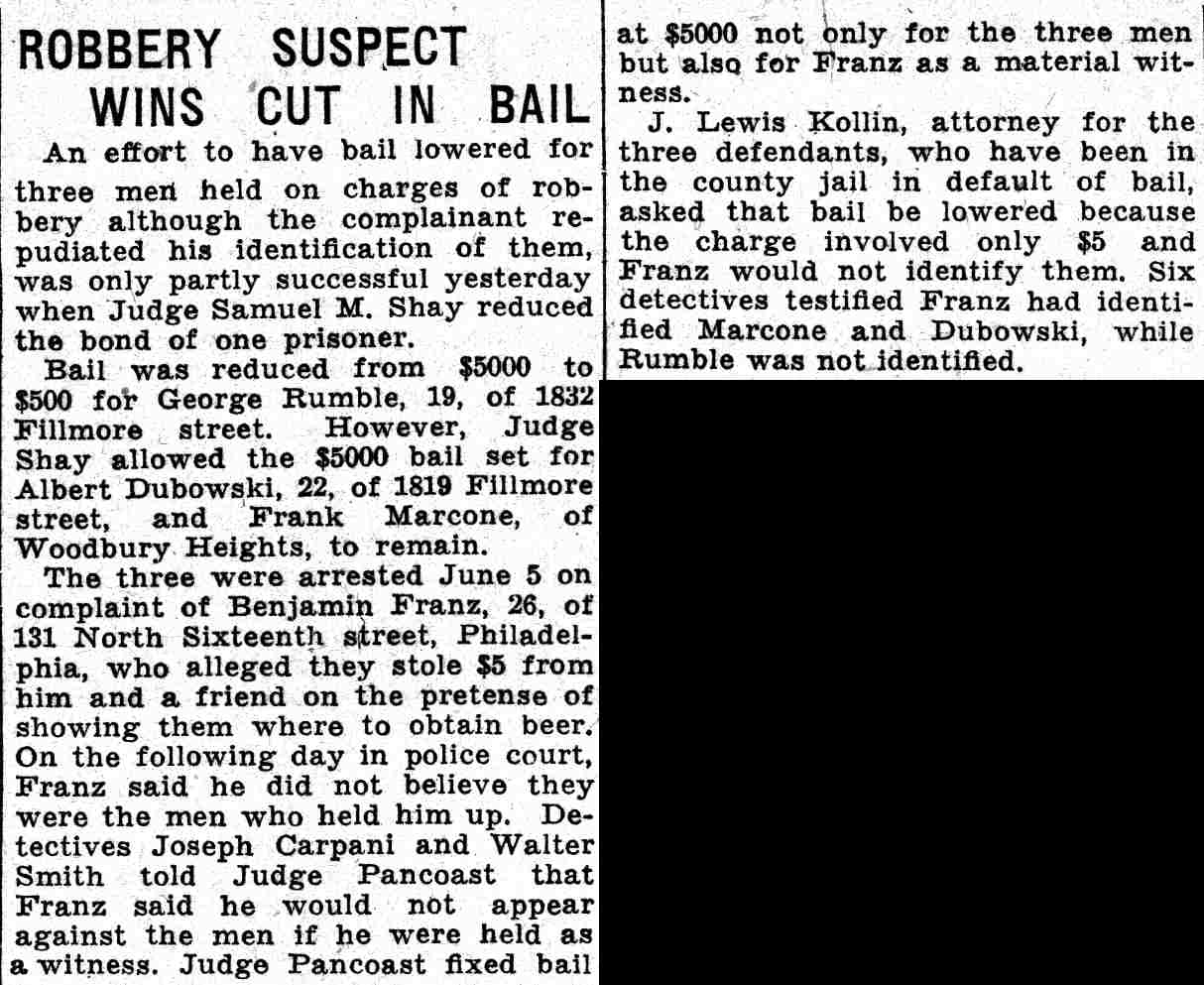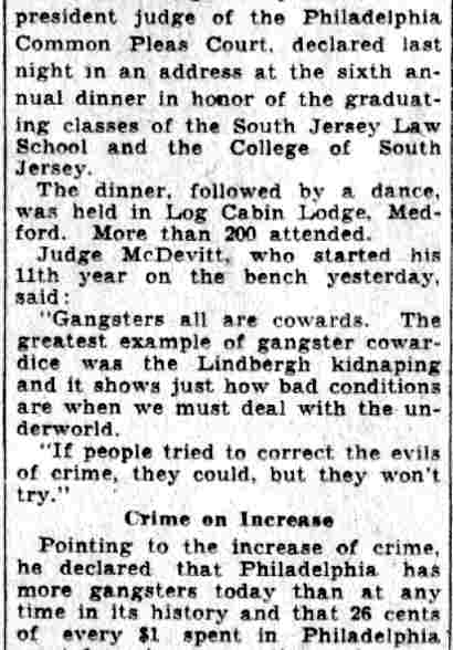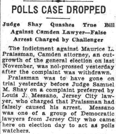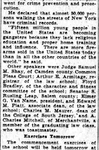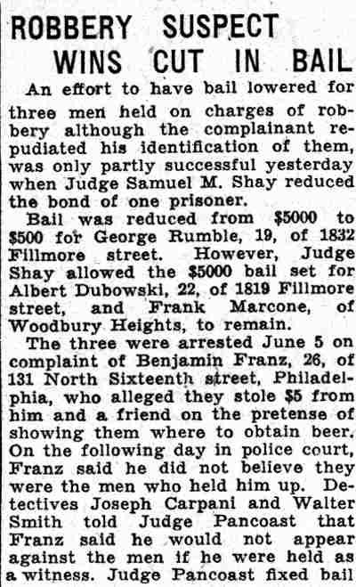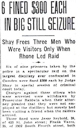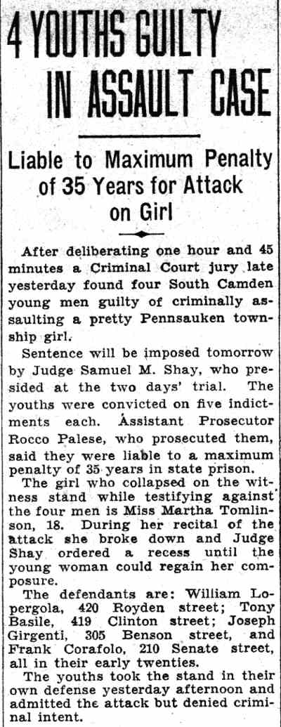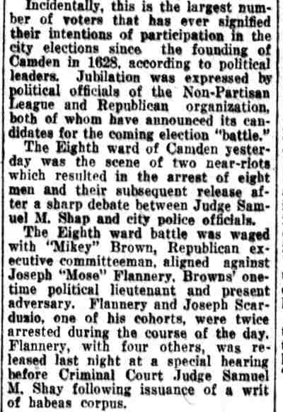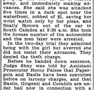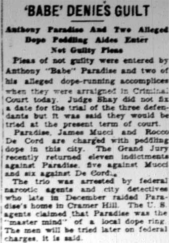 Camden Courier-Post February 9, 1928 anthony "babe" Paradise was arraigned in Criminal Court, Judge Samuel M. Shay presiding, along with Rocco DeCord and James Mucci |