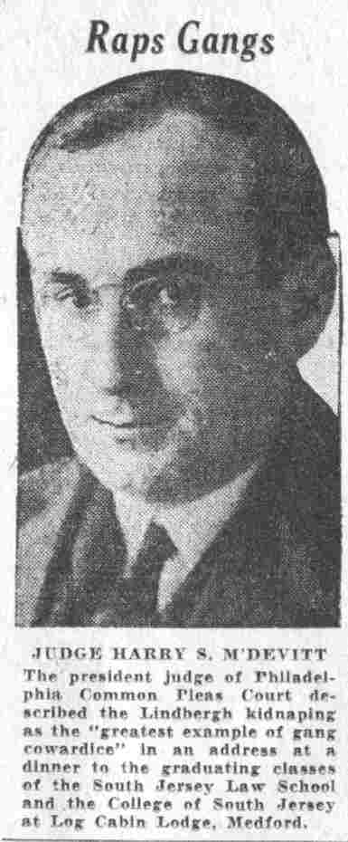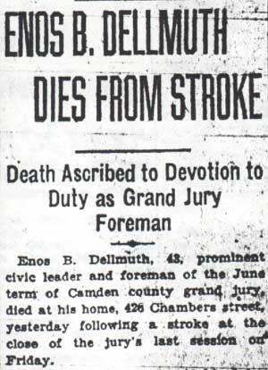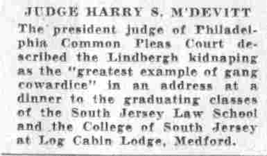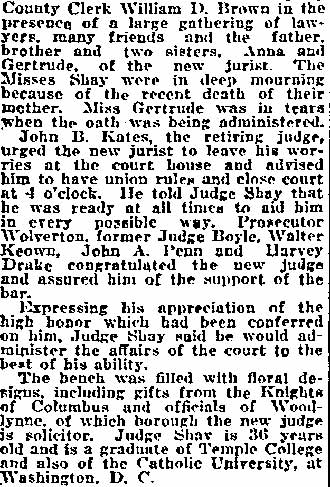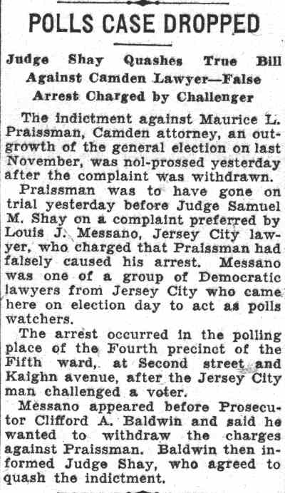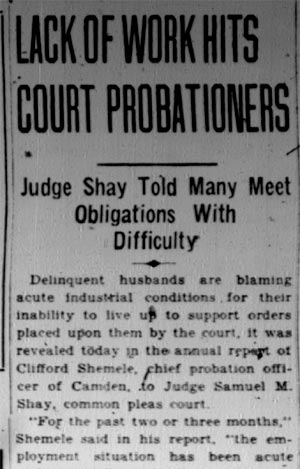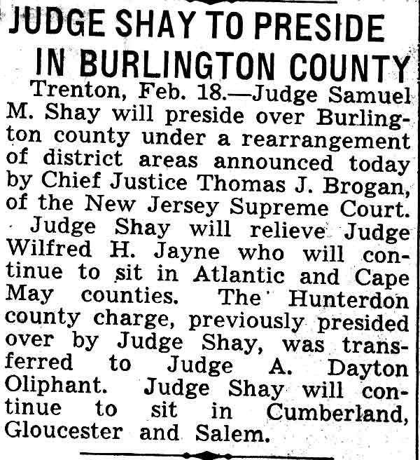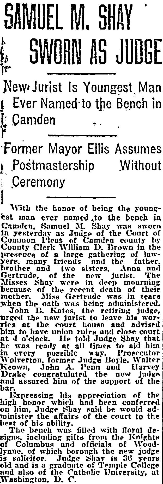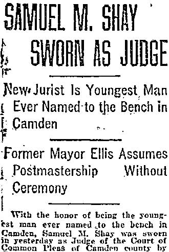 SAMUEL M. SHAY was born in New Jersey around 1885. He was appointed to a five-year term as Judge of the Common Pleas Court in Camden County in March of 1922 by Governor Edwards. He was reappointed in 1927. During this time Samuel Shay was involved with several business and civic groups, and was active in the fund raising drive that culminated in the building of the Walt Whitman Hotel at Broadway and Cooper Street. Judge Shay married at the age of 41. At the time of the April 1930 Census, he was renting a house at 314 Volan Street in Merchantville with his wife Alice and two daughters, Elizabeth A., not yet 2, and Joan E. Shay, 8 months of age. The Shays lived adjacent to E. Huelings Antrim, whose family business, Antrim Hardware, operated in Camden for over a century. A son, Samuel, was born after the Census was enumerated. Samuel M. Shay had passed away by the time the 1947 Camden City Directory was compiled. His wife and children will still residing in Merchantville, at 121 Browning Road, a block which included Albert S. Woodruff at 101; Dr. A Lincoln Sherk at 106; contractor Edward Ellis at 125; the Bottomley family, who were connected to the Howland Croft & Sons Co. textile mill in Camden, at 129; E. Huelings Antrim at 131, and former Camden Mayor Roy R. Stewart at 226. |