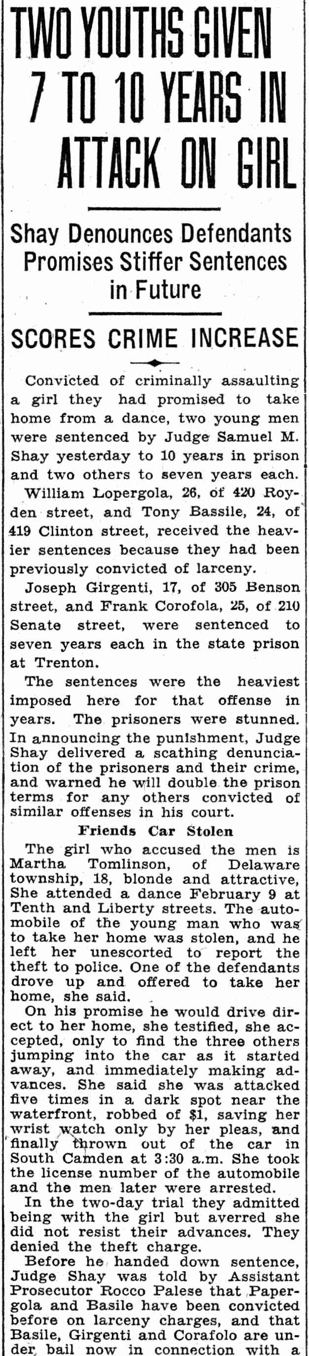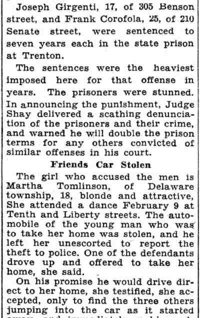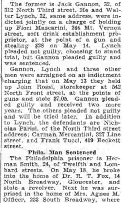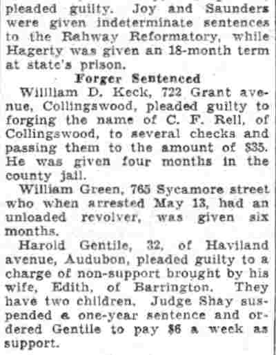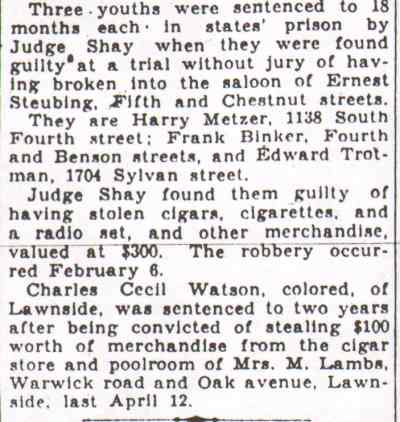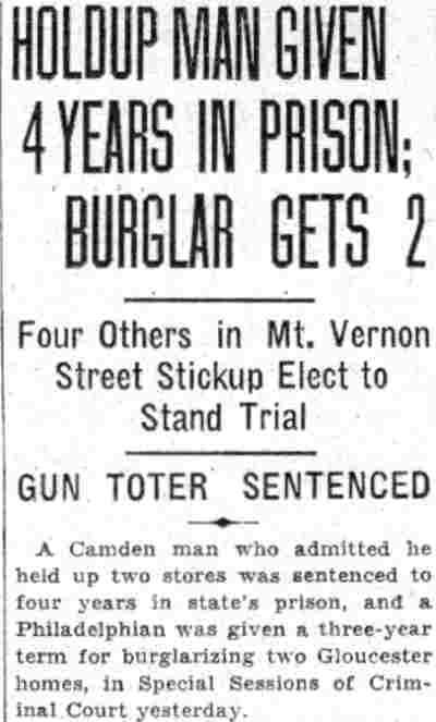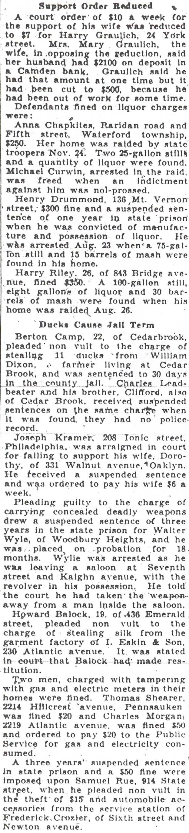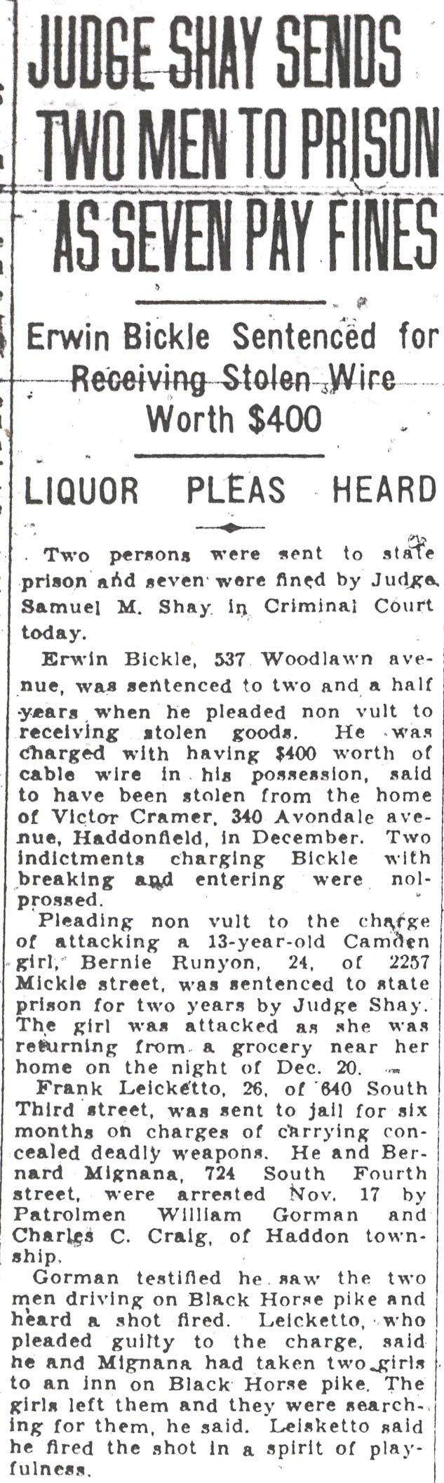 Who Turned Bandit Jailed 18 Months For $70 Holdup Five state prison sentences, four "light" terms in the county jail, a fine, a suspension of sentence and a sending of a youth to reform school were among the rulings of Judge Samuel M. Shay yesterday in Special Sessions of the Camden County Criminal Court. A former policeman, who turned bandit, was among those given prison terms. Leniency was accorded a father who abandoned and failed to support a boy, but with the promise he must stay away from women to keep out of jail. Parker Hunter, of 1722 Ferry Avenue, pleaded guilty to breaking and entering a gasoline service station at broadway and Webster streets, on the night of July 14 and stealing seven quarts of oil. Hunter's plea that he was intoxicated at the time did not save him from a 60-day sentence in the county jail. Girder Thieves Jailed John Capello, 18, of 1291 Decatur Street, pleaded guilty to two indictments charging him with the theft of an automobile of Abraham Schribner, Pleasantville, on July 29, when the car was parked in front of the owner's store at broadway and Kaighn Avenue. Patrolman Thomas Welsh caught the defendant after an exciting chase through South Camden, in which several shots were fired. Capello also pleaded guilty to breaking into the home of Mrs. Jennie Barriger, 1293 Decatur Street, on July 27, and stealing $25. Judge Shay sentenced him to the Reformatory. George Edmonds, 48, and Alonzo Martin, 31, both of 1300 South Eighth street, were sentenced to from one to three years each when they pleaded guilty to the theft of steel girders and beams belonging to the Acres of Diamonds Realty Co., near Central Airport. The robbery occurred on July 5. It was charged that the two men cut the girders and beams into small pieces with a cutting torch and sold them to a junk dealer. The beams were valued at $957. Two Years for Gun Toter Emmanuel Trappan, 33, 473 East Rittenhouse street, Philadelphia, a paroled convict from the Eastern Penitentiary was sentenced to from two to three years when he pleaded guilty to a charge of carrying concealed deadly weapons. He was arrested at 3 a. m. on July 17 by William Markward, 513 North Tenth Street, a special officer, near Second and Vine streets. The prisoner told the court he had come to Camden to attend a fireworks display in connection with the celebration of Our Lady of Mt. Carmel day. "So you came to see the fireworks," said Judge Shay. "I imagine you saw them well at 3 a. m., didn't you?" "No, Your Honor, they were over." "Well," continued the judge, "I would hate to see you disappointed." He paused to look at the clock. ”I’ll show you some at 11 a. m. Two to three years." Ex-Cop Sentenced William F. McKittrick, Somerdale, was given a one year's suspended sentence when he pleaded guilty to a charge of deserting his 12-year-old son and failing to support him. William Stainker, also of Somerdale, brother-in-law of the prisoner, told the court that McKittrick spends all of his money on other women. In suspending sentence, Judge Shay told McKittrick, "If I hear of you running around with any women back to jail you go." Floyd Griffin, Lucaston, a World War veteran and a former Philadelphia policeman, was sentenced to state prison for a term of from 18 months to seven years on a charge of holding up and robbing Edward Glassburg, a milk wagon driver at Lindenwold on July 10. He took $70 away from the driver at the point of a gun, it was testified. Three Years on Girl's Charge Marvin Taylor, of 931 Howard Street, was sentenced to serve 18 months to three years when he pleaded non vult to a statutory charge brought by the parents of a 9-year-old girl. Roland Greer, of 332 North Second street was given a three months county jail sentence when he entered a guilty plea to a statutory charge, preferred by a 14-year-old girl. Garry Denney, 1070 Sycamore Street, was fined $100 when he pleaded guilty to breaking into the home of his sister-in-law, Marie Sims, 358 Walnut Street. Edward Lewis, of 327 cole street and charles dunn, 611 Mt. Vernon Streets, pleaded guilty to breaking and entering the plumbing supply house of the J. D. Johnson Co., Newton Avenue and Division Street, on July 5, and taking a quantity of copper beer coils. They were sentenced to serve six months each. Two youths who pleaded guilty to tearing fixtures from a Clementon home, were sentenced to serve indefinite terms in Rahway by Judge Shay. They are Ralph Ernst, 16, of 19 Atlantic Avenue, Clementon, and Frank Medick, 16, of Lucaston.. |