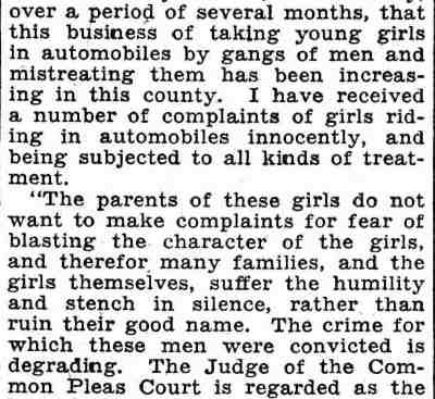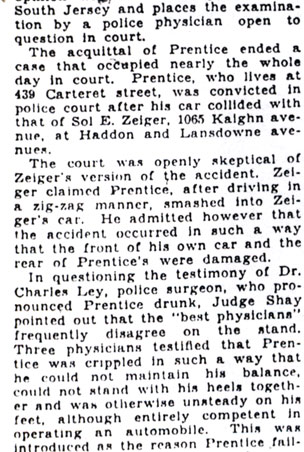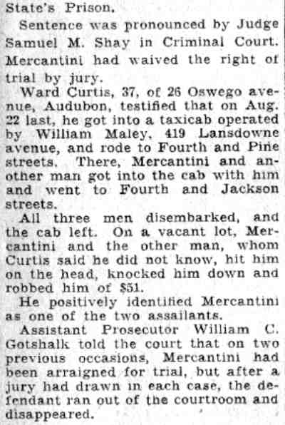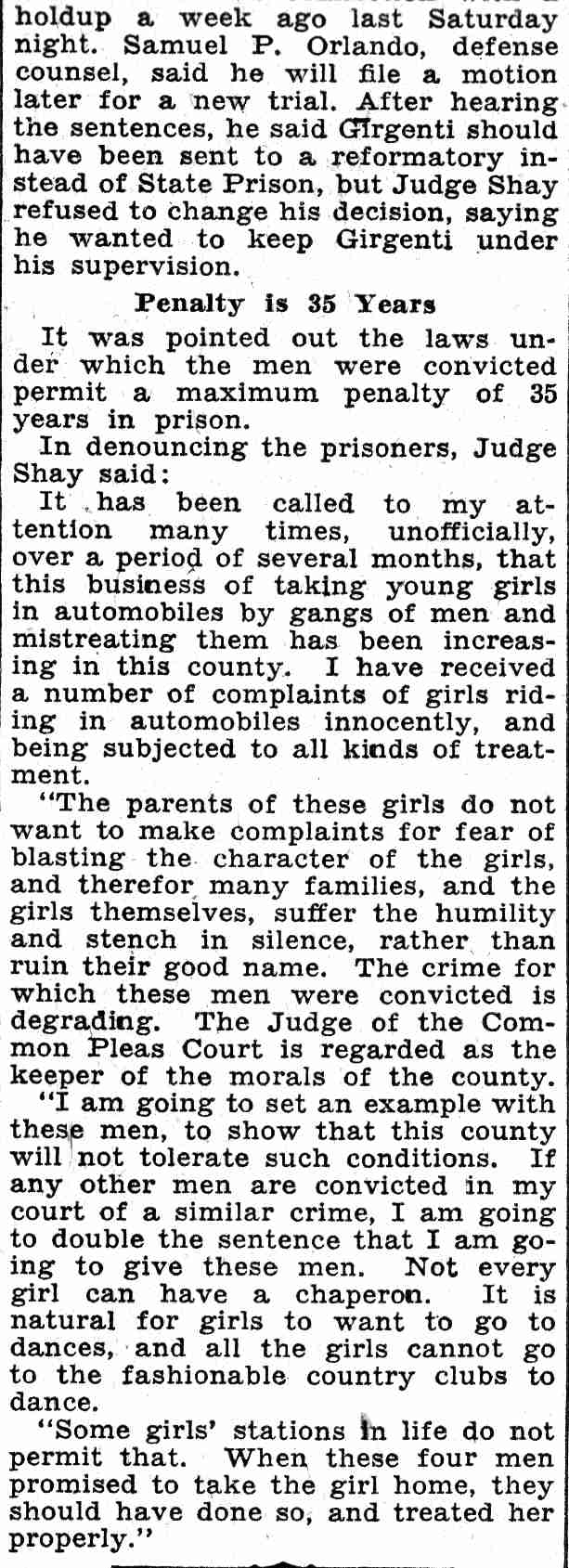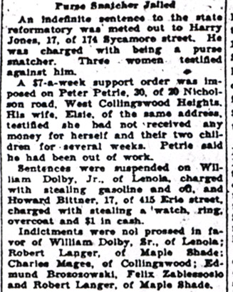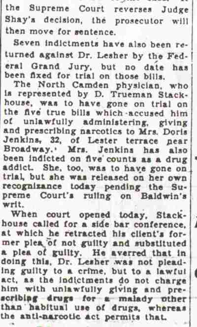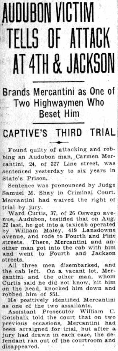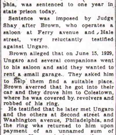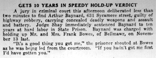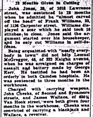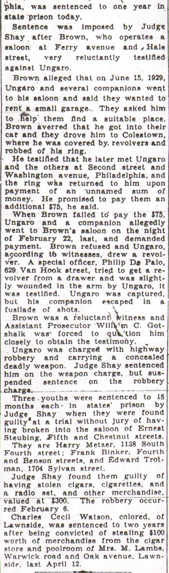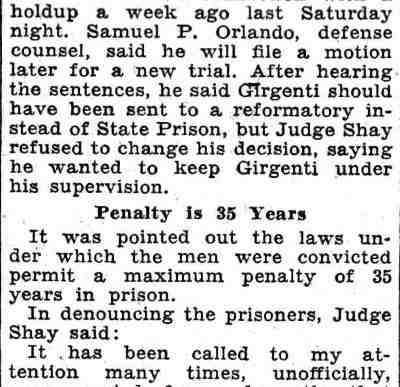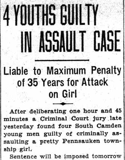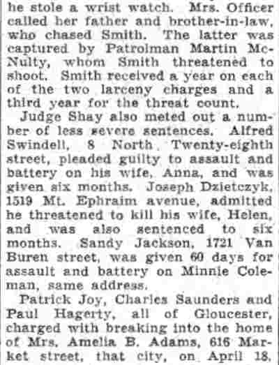 Who Turned Bandit Jailed 18 Months For $70 Holdup Five state prison sentences, four "light" terms in the county jail, a fine, a suspension of sentence and a sending of a youth to reform school were among the rulings of Judge Samuel M. Shay yesterday in Special Sessions of the Camden County Criminal Court. A former policeman, who turned bandit, was among those given prison terms. Leniency was accorded a father who abandoned and failed to support a boy, but with the promise he must stay away from women to keep out of jail. Parker Hunter, of 1722 Ferry Avenue, pleaded guilty to breaking and entering a gasoline service station at broadway and Webster streets, on the night of July 14 and stealing seven quarts of oil. Hunter's plea that he was intoxicated at the time did not save him from a 60-day sentence in the county jail. Girder Thieves Jailed John Capello, 18, of 1291 Decatur Street, pleaded guilty to two indictments charging him with the theft of an automobile of Abraham Schribner, Pleasantville, on July 29, when the car was parked in front of the owner's store at broadway and Kaighn Avenue. Patrolman Thomas Welsh caught the defendant after an exciting chase through South Camden, in which several shots were fired. Capello also pleaded guilty to breaking into the home of Mrs. Jennie Barriger, 1293 Decatur Street, on July 27, and stealing $25. Judge Shay sentenced him to the Reformatory. George Edmonds, 48, and Alonzo Martin, 31, both of 1300 South Eighth street, were sentenced to from one to three years each when they pleaded guilty to the theft of steel girders and beams belonging to the Acres of Diamonds Realty Co., near Central Airport. The robbery occurred on July 5. It was charged that the two men cut the girders and beams into small pieces with a cutting torch and sold them to a junk dealer. The beams were valued at $957. Two Years for Gun Toter Emmanuel Trappan, 33, 473 East Rittenhouse street, Philadelphia, a paroled convict from the Eastern Penitentiary was sentenced to from two to three years when he pleaded guilty to a charge of carrying concealed deadly weapons. He was arrested at 3 a. m. on July 17 by William Markward, 513 North Tenth Street, a special officer, near Second and Vine streets. The prisoner told the court he had come to Camden to attend a fireworks display in connection with the celebration of Our Lady of Mt. Carmel day. "So you came to see the fireworks," said Judge Shay. "I imagine you saw them well at 3 a. m., didn't you?" "No, Your Honor, they were over." "Well," continued the judge, "I would hate to see you disappointed." He paused to look at the clock. ”I’ll show you some at 11 a. m. Two to three years." Ex-Cop Sentenced William F. McKittrick, Somerdale, was given a one year's suspended sentence when he pleaded guilty to a charge of deserting his 12-year-old son and failing to support him. William Stainker, also of Somerdale, brother-in-law of the prisoner, told the court that McKittrick spends all of his money on other women. In suspending sentence, Judge Shay told McKittrick, "If I hear of you running around with any women back to jail you go." Floyd Griffin, Lucaston, a World War veteran and a former Philadelphia policeman, was sentenced to state prison for a term of from 18 months to seven years on a charge of holding up and robbing Edward Glassburg, a milk wagon driver at Lindenwold on July 10. He took $70 away from the driver at the point of a gun, it was testified. Three Years on Girl's Charge Marvin Taylor, of 931 Howard Street, was sentenced to serve 18 months to three years when he pleaded non vult to a statutory charge brought by the parents of a 9-year-old girl. Roland Greer, of 332 North Second street was given a three months county jail sentence when he entered a guilty plea to a statutory charge, preferred by a 14-year-old girl. Garry Denney, 1070 Sycamore Street, was fined $100 when he pleaded guilty to breaking into the home of his sister-in-law, Marie Sims, 358 Walnut Street. Edward Lewis, of 327 cole street and charles dunn, 611 Mt. Vernon Streets, pleaded guilty to breaking and entering the plumbing supply house of the J. D. Johnson Co., Newton Avenue and Division Street, on July 5, and taking a quantity of copper beer coils. They were sentenced to serve six months each. Two youths who pleaded guilty to tearing fixtures from a Clementon home, were sentenced to serve indefinite terms in Rahway by Judge Shay. They are Ralph Ernst, 16, of 19 Atlantic Avenue, Clementon, and Frank Medick, 16, of Lucaston.. |