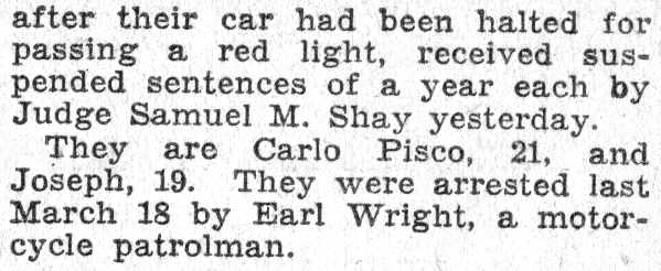 GUILTY OF DOPE PEDDLING Jury Out Less Than Hour; 'Babe Paradise' Up Next Week Convicted by a Criminal Court jury of conspiracy and the possession and sale of narcotics, Joseph Colanduno, 29 years old, 431 Walnut Street, said by police to be a member of a powerful dope ring in Camden, will be sentenced by Judge Shay tomorrow morning. The jury deliberated less than an hour before returning a verdict of guilty on seven indictments, marking the end of the first of a series of "dope" trials scheduled to be heard by Judge Shay. The most important hearing will be that of anthony "babe" Paradise, who has been indicted in eleven counts on narcotics charges, six of them true bills accusing Paradise and James Mucci with conspiracy to sell narcotic drugs. Another alleged member of the gang, rocco decord, 221 Spruce Street, who recently pleaded guilty to six indictments and who turned state's evidence at yesterday's trial, will be sentenced later. Still another alleged "dope runner". Alex Frumento, is being sought by police. DeCord and three confessed addicts testified against Colanduno at the trial yesterday. DeCord said that he had been hired by the defendant and Frumento to sell small packages marked "H" and "C" to certain men who had been introduced to him. DeCord declared that he did not know what the packages contained, nor did he ever use dope. The drug users, Nolan Clark, 28 years old who gave no address; George "Gyp" Haines, 29 years old, 527 Spruce street, and Andrew Hill, 20 years, locust street and Kaighn Avenue, declared they had brought dope from Colanduno on various occasions. Colanduno, who until last December operated the Primrose Inn at Barrington with Frumento as his partner, denied that he ever possessed drugs or hired DeCord. His arrest, he said, was a "frame-up" engineered by his "enemies". His wife Hazel and his wife's grandmother, Mrs. Laura Brakeman, who lives with Mrs. Colanduno, both testified that they never had seen DeCord or the three addicts buying drugs at the inn, as they declared on the witness stand. James Gatti, 18 years old, of Philadelphia, who is serving a six-month term in the county jail for robbery, took the stand on Colanduno's behalf. He testified that DeCord had told him in the jail that the confessed dope peddler's statement implicating Colanduno had been forced from him by police. Assistant Prosecutor Joseph A. Varbalow stated that the Paradise case probably would be disposed of next week with the return from Florida of Samuel P. Orlando, attorney for the alleged "Dope King of Camden.", |