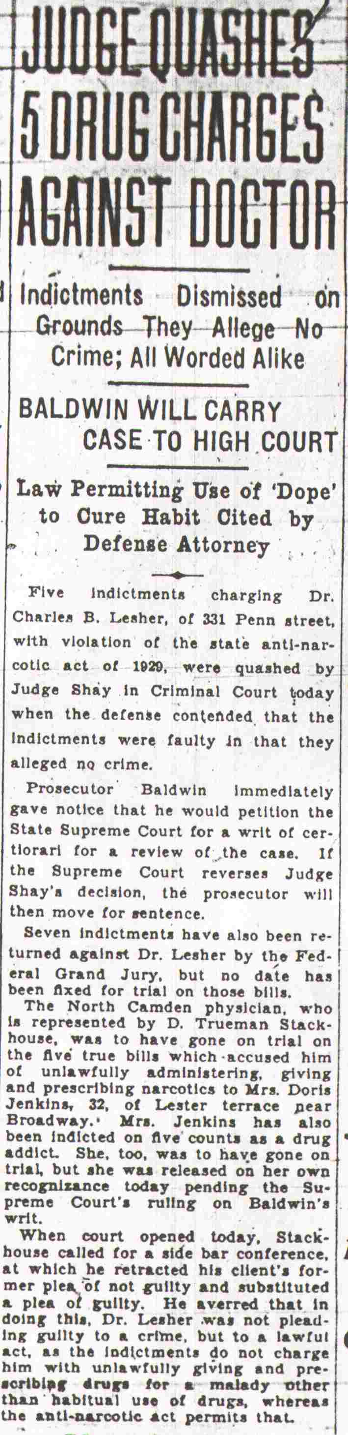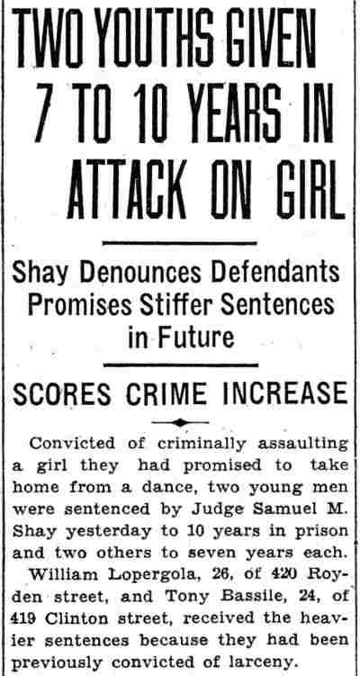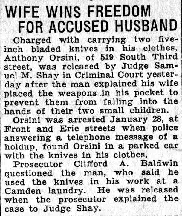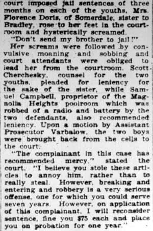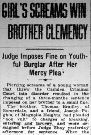 MEN A court room crowded to the doors was thrown into a turmoil of excitement yesterday when five women became hysterical upon hearing Judge Samuel M. Shay impose prison terms on three men who pleaded guilty to vandalism in special session of criminal court. Completely losing control of themselves, the women threw their pocketbooks, hats and gloves across the court room. Screaming at the top of their lungs, they were joined in the bedlam by small children they had brought to court with them. All five women fainted and were carried from the court room by attendants. When they were revived they continued the disturbance In anterooms and corridors. The names of the women were not obtained by officials. The jail sentences were meted out by Judge Shay as the opening shot in his campaign to stamp out vandalism in Camden county. The three men and their sentences are Elmer Baxendale, 32, of 1647 Forty-ninth Street, Pennsauken, two to three years in state prison; Thomas Henry, 32, of 1211 Bergen Avenue, 18 months, and John Schwab, 31, of 1739 Lexington Avenue, Pennsauken, 18 months. Judge Shay sounded a warning that he will show no mercy to convicted vandals, who may, in the future, expect a sentence of 10 years. The jurist was angered when information that one of the three defendants had pleaded not guilty, instead of guilty, as the judge had understood, and ordered him to trial immediately with the promise of 10 years if found guilty. After a conference with, counsel, the defendant, Schwab, let the guilty plea stand. Prosecutor Clifford A. Baldwin told the court Baxendale had admitted the theft of plumbing and other fixtures from 13 houses in the vicinity of Forty-fourth street and Pleasant avenue, Pennsauken, and Forty-ninth street and Westfield Avenue, Pennsauken. Henry admitted to 10 robberies and Schwab to two, he added. "The kind of stuff you fellows have been doing strikes at the very foundation of organized government said the court: "We can lock our automobiles and jewelry, but owners of unoccupied houses are at the mercy of men like you. I am not going to tolerate it." He then pronounced sentence and the women, rising in their seats, began screaming. When some semblance of order was restored, C. Lawrence Gregorio, an attorney, addressed Judge Shay, saying: "You must have misunderstood my client, Schwab, he pleaded not guilty." "All right," said the court, making no effort to hide its anger at the whole procedure, "if he does, we'll put him on trial now, right this minute. Prosecutor, go ahead and proceed with your case. , "But I'm going to tell you this, Mr. Gregorio. If your client is found guilty, I'm going to sentence him to ten years in the state prison. Go ahead and put him on tria1." Gregorio, after conferring with Schwab, said the prisoner was satisfied to let the original sentence stand and he would plead guilty. "You can broadcast to the city and county," the court then said, "that I have a way to break up this vandalism. I'm going to sentence convicted vandals to 10 years." |
