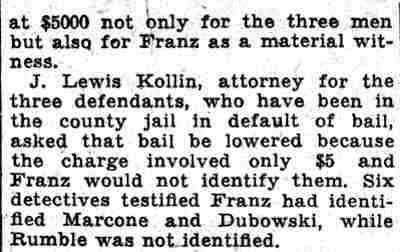 that Called 'Big Shots' The two brothers were character ized as "big shot numbers barons" by Assistant Prosecutor William C. Gotshalk in his closing argument to the jury. Referring to a woman and her son, who were burning numbers slips when raiders entered the establishment, Gotshalk said: . "They might ask us why we don't have that woman and her 17-year-old son on trial here. When the police make an arrest the public wants to know why we don't get the big shots. Well, here they are," pointing at the Klostermans. "Here are the big shots," The Klosterman saloon, Mechanic and Green Streets, was raided December 10 by city detectives who testified Tuesday they followed a footpath to an adjacent house at 1312 Green Street. They broke down the door and found a woman and her son burning numbers slips. Acting Lieutenant Louis Shaw, of the city detective bureau, testified he recovered some of the slips and also found a brief case containing numbers slips and a post card addressed to "F. Klosterman." Detective Clarence Arthur and Patrolman John Kaighn corroborated Shaw's testimony. Says He Was Visitor The defense opened with Joseph Klosterman on the stand. He testified he had nothing to do with the saloon when it was raided, but merely happened to be in there for a drink when the raiders entered. He said he had owned the saloon for three and a half years but sold it last July for $100. He never had any connection with the Green Street house, he declared. He is now a plumber, Klosterman averred. When Assistant Prosecutor Gotshalk asked him if he had ever been convicted of crime, Keown asked that the jury be withdrawn as he wanted to make another motion. Court then recessed. When court resumed Mrs. Anna Pogroszewski, of the Green street address, took the stand. She testified the Klostermans were not connected with her home in any manner. She testified she had rented a room to a man named "Tommy" and all the numbers apparatus was his. When he moved out, he left the slips and adding machines there, she said, and she had cleaned out his room and was burning the papers when the raiders arrived. Fred Klosterman, who resides at 1255 Decatur Street, denied he was a "numbers baron" and said he merely "happened" to be there on the day of the raid. Under cross-examination he admitted having pleaded guilty to slot machine charges in June of last year. |