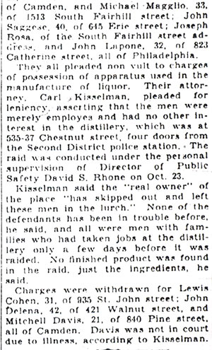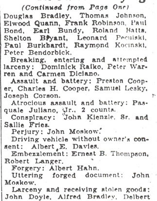 GOODS COST MAN $50 IN FINE A South Camden man charged with receiving stolen goods was fined $50 by Judge Samuel M. Shay in Criminal Court yesterday. He was charged with disposing of several cartons of cigarettes allegedly stolen from chain grocery stores. He is Joseph Sepicato, 21, of 251 Mt. Vernon street whose plea of not guilty was among a total of 20 cases listed to be heard. Three men charged with robbing a Pennsylvania railroad freight car of 144 pairs of shoes and a bale of wash cloths near Fish House entered pleas of not guilty. They are William Kirk, Harold and George Walters. Two men arrested with Kirk and the Walters brothers are now serving prison terms after conviction. They are William Hibbell, and Herbert Pratt, who were given six and 18 months sentences respectively by Judge Shay several weeks ago. Other pleas on, indictments returned by the April term grand jury include: Charles Joslin, Dominic Groge and Anthony Scott who pleaded not guilty to breaking and entering and larceny; William Shinn, guilty of breaking and entering; Phillip Winters, not guilty to charges of, non support; Raymond Ballinger, James Vennell, Nick Simone and Walter Hunt, all pleaded not guilty to charges of statutory offenses. Spencer Murray pleaded not guilty to receiving stolen goods; Harry Clipper, entered a plea of guilty charges of tampering with a meter. Joseph Smitka and Theodore Gahricki, alias Theodore Chaney both pleaded guilty to larceny charges and receiving stolen goods. William Di Paolo, I.J. Lewis, William Baxter and Charles Atkins pleaded not guilty to charges of assault and battery; James Cox entered a plea of not guilty to a breaking and entering charge. . |