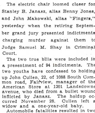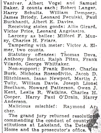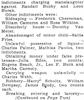 INDICTED ON MURDER CHARGE William Schiller, 30-year-old former summer cop, was indicted for murder today and must stand trial for the fatal shooting of his father, Jacob Schiller, 72, well-known and well-liked politician. The indictment was one of 39 true bills in a presentment made by the new September term of grand jury to Judge Samuel M. Shay. In addition to Schiller, five other men were indicted for murder. These are Peter Citeroni, 28, of 919 South Fifth Street; Samuel DiGiacomo, 18, of 314 Berkley Street; Stanzo Palumbo, 20, of 314 Clinton Street; Joseph Patricci, 21, of 320 Berkley Street, and Fred Williams, colored, of Camden. All are in the county jail without bail and awaiting trial. Schiller shot and killed his father at their home, 2420 Carman Street, last Saturday night. The elder Schiller had long tried to act as a conciliator between his son and the latter's wife, Augusta, who were estranged. Mrs. William Schiller wrote what police described as a "suicide note" and was found wandering dazedly through the city streets Monday, asserting that her father-in-law had been killed while trying to protect her. Citeroni fatally shot his sweetheart, Jennie Zucchi, 21, of 322 Warren Avenue, on August 30, at Haddon and Wright avenues. She died September 3. Citeroni, who has twice attempted to commit suicide, claimed Miss Zucchi had ended their friendship because of her father's objections to him. Bill in ‘40 cent Murder’ Palumbo, DiGiacomo and Patricci are indicted in the "40-ccnt murder" of Archie Pidgeon, who was found slain at Third and Berkley Streets August 21. The three are said to have admitted they held up Pidgeon and got only 40 cents from him, which they spent for "hot dogs" and coffeee. Williams, who once served time for the murder of a woman in Atlantic County, is indicted this time for the murder of Ida Paynter on August 12. A former Camden woman was indicted on a charge of abandoning -her two children, and her husband was indicted on a charge of non-sup-port. They are Harry Mulhearn, 579 mickleStreet, and Mrs. Lillian Mulhearn, of Deepwater Lighthouse. Mrs. Mulhearn was arrested September 7 on a warrant on September 7 by Mrs. Louise F. Walsh, secretary of the Society for the Prevention of Cruelty to Children. Mrs. Walsh charged that the parents had shown no disposition to take care of their children, Lillian, 6, and Verna Mae, 5, who have been under the charge of the Sheltering Arms Home. Other Indictments The other indictments were as follows: Receiving stolen goods- Richard A. Wiggins, Lawnside; Harry Smith and William Bow, Camden; Joseph Hampton, Gloucester; Edward Hendricks, Gloucester. Non support- Charles Van Dusen, Camden; Elmer P. Peters, Gloucester; John Shoemaker, Clementon; Martin Burns, Camden; William Lachzynska, Camden; George A. Spingler, Barrington; William Patten, Camden; Jerry Fagen, Gloucester; Harry L. Blaetz, Merchantville, and Frank Kunitz, Camden. Breaking and entering-Ira Munroe, 10 indictments for breaking into houses at Haddonfield; Charles Priesly, indicted with Munroe in two true bills; Charles Hill, Camden. Carrying concealed deadly weapons- Trim L. Austin, Pennsauken, for carrying brass knuckles. Embezzlement- Raymond Weaver, Pennsauken, $543.50 from the Standard Oil Company. |
