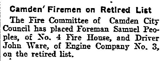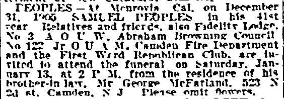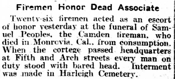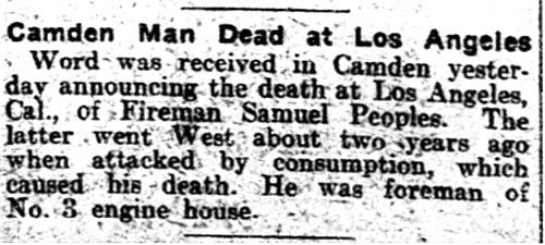 SAMUEL PEOPLES was born in Pennsylvania in November of 1864, and appears to have come to Camden around 1889. He married his Irish-born wife Mary Robinson around 1888. He first appears in Camden's City directories in 1890, living at 621 North 2nd Street and working as an iron moulder in a foundry in Philadelphia. By 1892 he had moved to 1641 Broadway and stayed there into the following year. By the end of 1894 he had moved to 1613 Broadway where he remained into 1895. Once having moved to Broadway, Samuel Peoples became politically active in the early 1890s as a Republican from Camden's Eighth Ward. Samuel Peoples was appointed to the Camden Fire Department on November 27, 1894 as a replacement for William Bogia, who had passed away. He was assigned to Hook and Ladder Truck No 1, quartered on North 5th Street between Arch and Market Streets. When Samuel Peoples was first assigned to Hook and Ladder Truck No 1, the company was led by Foreman, Benjamin L. Kellum; the tillerman was Peter S. Gray; and the laddermen consisted of Steward D. Bakley, john gray, Edward Weston, Samuel Peoples, and joseph logue. The 1896 City Directory shows Samuel and Mary Peoples at 525 South 2nd Street. By 1897 they had moved to 606 Point Street. On November 27, 1899 Samuel Peoples was promoted to foreman, the equivalent of Captain, of Hook and Ladder Company No 3. The 1897 City Directory shows Samuel Peoples at 606 Point Street, a when the 1900 Census was taken Samuel Peoples, wife Mary, and daughter Vera living at 606 Point Street in North Camden. Also living with them at the time of the census were Mary's sister Lydia and her husband David Robinson. Sadly within a few years of his promotion, Samuel Peoples contracted tuberculosis, in that time a fatal disease with no cure. He was placed on the retired list in November of 1904 and moved to California, where it was thought that the climate might alleviate his symptoms. Samuel Peoples died at Monrovia, California on December 31, 1905. He was brought home to New Jersey and buried at Harleigh Cemetery in Camden. Samuel Peoples was survived by his wife and daughter, who were living at 604 North 2nd Street when the 1910 Census was enumerated. Vera Peoples was still living at that address as late as January of 1920. |