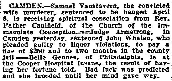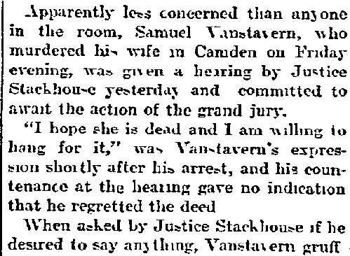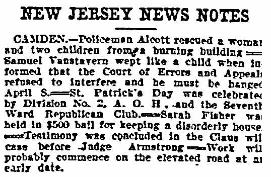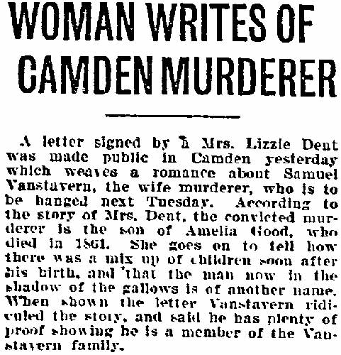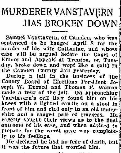 SAMUEL VANSTAVERN was married to Kate Lamb, daughter of one-time Camden city councilman Daniel Lamb. They had one child, a son named Walter. The marriage was a stormy one and the Vanstaverns separated in the 1890s. Samuel Vanstavern shot his wife to death on November 28, 1901. He was tried, found guilty of murder, and was executed by hanging at the Camden County jail on April 8, 1902. |