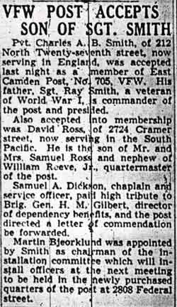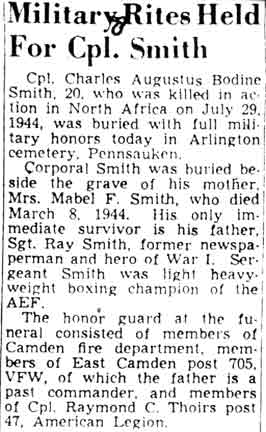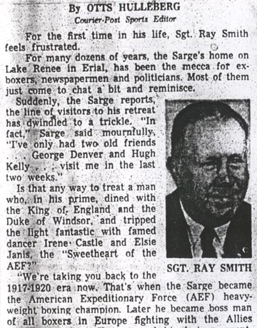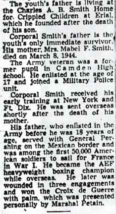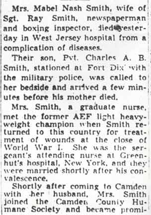 SERGEANT RAY SMITH was born Lucius Raymond Smith on June 6, 1895. Enlisting in the United States Army at 17, he served in Mexico with General Pershing's expedition in pursuit of Pancho Villa. A combat veteran of World War I, he was wounded while serving in France during that conflict, and was awarded the Croix de Guerre with palms, presented to him personally by Field Marshal Henri Petain. Sergeant Ray Smith had fought at least once as a professional before the war. During that time he came to prominence as a boxer, becoming the heavyweight champion of the American Expeditionary Force. Sergeant Ray Smith returned to professional boxing after the war. In 20 fights his record was 2 wins, 15 losses, and 3 no contest, not uncommon as in those days certain states while allowing pro boxing would not allow a winner to be declared. He fought some of the most famous boxers of his day, including eventual world heavyweight champion Gene Tunney, one-time middleweight champion Leo Houck, and heavyweight title contenders Tommy Gibbons and Bill "KO" Brennan. He fought Battling Levinsky for the Light Heavyweight Title, but lost on points. After hanging up his gloves, he remained in boxing as a referee, and was well known for fairness and good judgment. Settling in Camden NJ, he made his home in the 1920s and early 1930s at 31 North 25th Street, and later at 212 North 27th Street. Ray Smith worked a radio announcer and as sportswriter. Ray Smith was involved in many civic activities. He was the president of the Elks Crippled Children's Committee for over 20 years, was a four-time commander of VFW Post 705 in Camden, three-time commander of the August F. Walters Chapter No. 4 of the Disabled American Veterans, a member of the Raymond C. Thoirs Post 47 of the American Legion, Ring No. 6 of the New Jersey Veterans Boxing Association, and was involved in many, many other civic activities. He was on of the leaders of the bonus march for World War I veterans, and was associated with Congressman Charles A. Wolverton in veterans matters. In 1926 he ran for Republican committeeman from the Twelfth Ward with the support of Jake Schiller, but lost to Clay W. Reesman. Sgt. Ray Smith was working for the Courier-Post on the night of June 8, 1933 when he was hurt in a car accident while en route to New York to cover the Max Baer vs. Max Schmeling fight at Yankee Stadium. In May of 1934 he was a candidate for the Republican nomination for the new Jersey Assembly from Camden. In the fight for control of the Republican Party in Camden, he was an ally of Albert S. Woodruff. Raymond Smith was married to Mabel, and they had one child, a son, Charles Augustus Bodine Smith. who left school to enlist in the Army in 1942. Mabel F. Smith passed away in 1944, and sadly, Private Charles A.B. Smith died while serving in Algeria later that year. Sergeant Ray Smith moved to the Erial section of Gloucester Township NJ after World War II, where he founded and operated the Charles A.B. Smith Home for Crippled Children. He remained active in civic affairs. In February of 1959 he addressed the New Jersey Assembly on veterans issues. On April 20, 1959 he was honored by Ring 6 of the New Jersey Veterans Boxing Association as Man of the Year. An automobile accident in 1964 left Sgt. Ray Smith partially crippled, only able to walk with the use of braces and crutches. Refusing to give up his work on the crippled children's charities, he was still living at his home in Erial as late as December of 1967. Raymond Smith's later years were spent in Haddon Heights NJ. Sergeant Ray Smith passed away in February of 1979. |