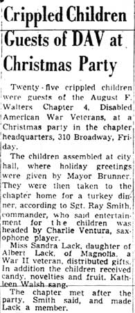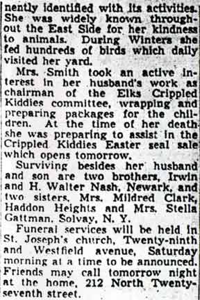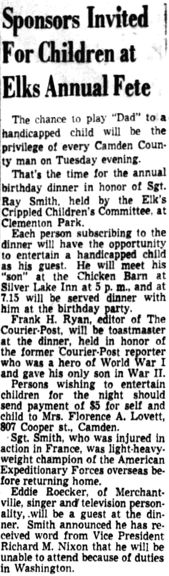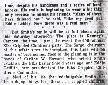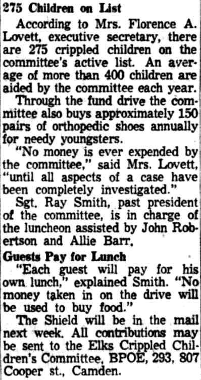 CHILDREN TO ATTEND OUTING 100 Little Folks to Be Guests on Sgt. Ray Smith's Birthday More than 100 crippled children from this vicinity will be entertained at the seventh annual Sgt. Ray Smith's crippled children's day and birthday party, next Monday. The party, an annual affair, is staged by the Elks' crippled childrens committee and the Sgt. Ray's birthday party committee. The youngsters will meet at the Elks Home, 808 Market street, and will be taken to Clementon Park in buses where Theodore Gibbs, manager of the park will throw open the entire facilities of the park for the crippled children, staging a special show in the after-noon. A luncheon will be served at the park by the committee. At four o'clock the youngsters will be taken to the Silver Lake Inn where a special amateur show will be staged on the lawn by the crippled children themselves. A sports entertainment will be staged by Otto O'Keefe, of the Veteran Boxers Association of Philadelphia, then dinner arranged by John E. Weber, proprietor of the Silver Lake Inn. During the dinner hour the youngsters, will be entertained, by talent from Philadelphia and nearby night clubs, with Otto O'Keefe presenting the acts. After the children's party, a dinner will be served in honor of Sgt. Ray Smith, on his 46th birth-day. Officers of the Crippled Childrens Committee headed by Smith include Homer H. Lotier, treasurer, and A. Lincoln Michener, secretary. Mrs. Florence A. Lovett is executive secretary. The party committee is headed by Carlton W. Rowand and Charles W. Anderson. Surrogate Frank B. Hanna is the treasurer. Those who have been invited to attend are Mayor George E. Brunner, Congressman Charles A. Wolverton, Prosecutor Samuel P. Orlando, Firmin Michel, Albert E. Burling, Albert Austermuhl, secretary of the Board of Education, George I. Shaw, Mary W. Kobus, director of Public Safety; Dr. Henry J. Schireson, Camden county freeholders Robert Worrell, Mrs. Alice Predmore, S. Norcross 3rd, members or Veterans of Foreign Wars of Camden County Council and many business men and civic leaders. Ladies of the Elks' Auxiliary who will assist with the children throughout the day are: Mrs. Alice Heck, president; Mrs. Sarah Austermuhl, Mrs. Reba Crawford, Mrs. Emma Vandergrift, Mrs. Tillie Weber, Mrs. Helene Sauerhoff, Mrs. Anna Rose, Miss Emma Lee, Mrs. Sallie Moore, Mrs. Marion Holdcraft, Mrs. Etta Preisendanz, Mrs. Eva Poland, Mrs. Lena Jantzen, Mrs. May Talman and Mrs. Irene Berg. |