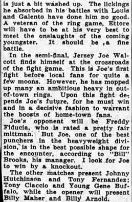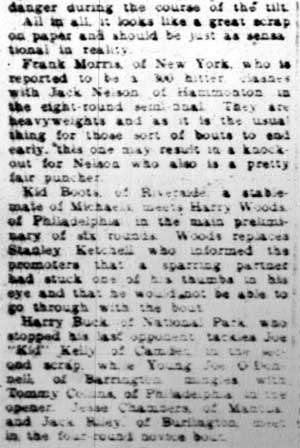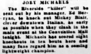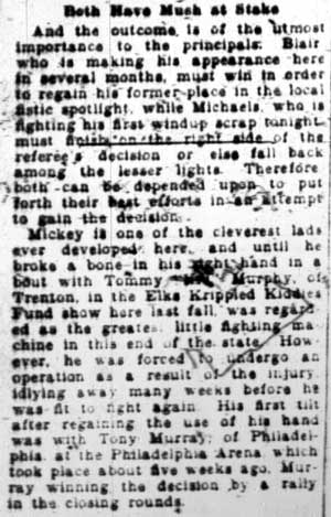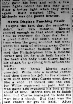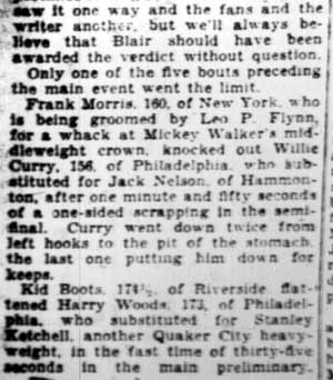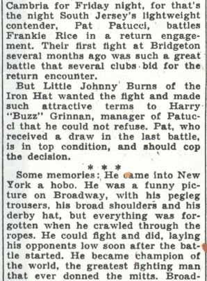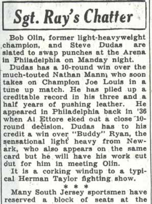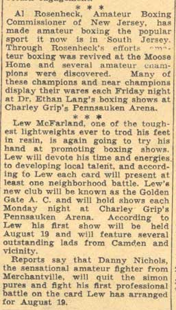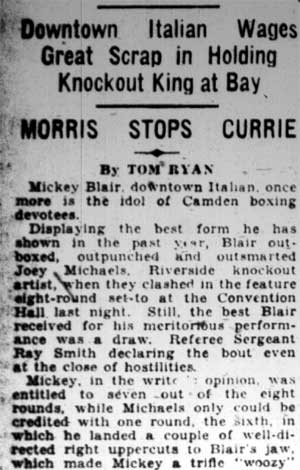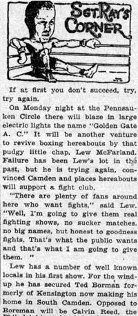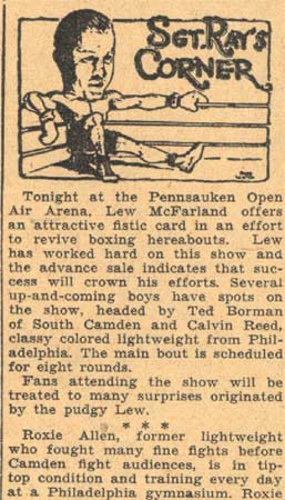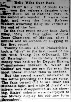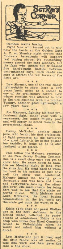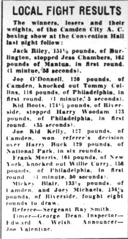 BATTLES ATTRACT BIG CROWD Fifteen sizzling amateur boxing bouts, together with nine acts of vaudeville, were presented to a capacity crowd in the St. Joan of Arc Church gym, Fairview. The proceeds derived from the affair will go toward the church building fund. In the feature bout, Bob Zimmerman, of Fairview, unintentionally fouled Eddie O'Tell of South Camden, in the first round and Referee Joe Bonnell immediately stopped the fuss. Zimmerman was in the lead when O'Tell, in attempting to avoid a left hook to the body, leaped into the air with the result that the punch landed low. Zimmerman, in order not to disappoint the crowd went three rounds with Mickey Murtha. Battling Mack and Pee Wee Ross staged a clown act, while Johnny Lucas met Billy De Lue; Tommy Lyons clashed with Jack Stanley; "Peaches" Gray tackled Terrible Pine; Joe Colon faced Billy Osborne, and George Anderson encountered Milton Bamford. All bouts were limited to three rounds. Deputy Boxing Commissioner Edward A. Welsh attended the affair, and when introduced by Announcer Bill Kennedy received an ovation that lasted fully five minutes. Mrs. Mary Walsh Kobus, a member of the city board of censors also was present. Sergeant Ray Smith assisted Bonell in refereeing, while John McGraw was timekeeper. It was one of the most successful affairs ever conducted by the church athletic association. |