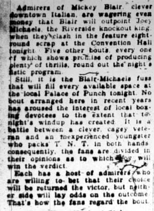 Not to be outdone by any local organization, Corporal Raymond C. Thoirs Post, of the American Legion, passed a resolution last night in favor of staging a monster boxing show at Convention Hall sometime next month. Half the receipts will be donated to further the Boy Scout Movement. Sergeant Ray Smith , former heavyweight boxer and now a licensed referee, was elected to head the committee on arrangements, which consists if ten members; Judge Frank F. Neutze, Dr. Irwin B. Deibert, Tom Taylor, J. Harry Ashton, Harry E. Bayne, George P. Rothermel, Albert Wehner, Fireman Ray Smith and Jack Weinberg will assist the sergeant in making the show a success. A businessmen’s committee also will be appointed, but as yet has not been named by the legion committee members. It is the intention of the committee to bring some of the best boxers in the country here for the show, which they will make an annual affair providing the initial one is a success. Chairman Smith stated today that he would apply for a boxing permit from Deputy Boxing Commissioner Edward A. Welsh at once. |