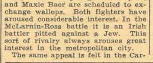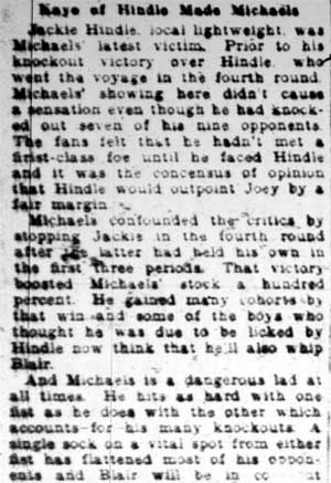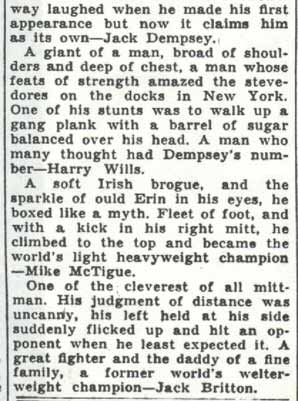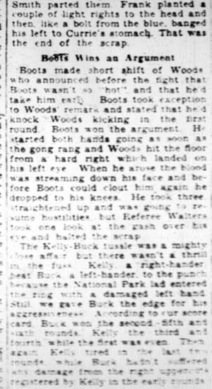 Charley Humes Roxie Allen Mickey Blair Shamus Maguire Eddie Chaney Pee Wee Ross Jackie Hindle Watson Finch George Abner Nick Nichols Dixie Allen Mike O'Dowd Benny Leonard Pete Herman Jimmy Wilde Gene Tunney John Smith Lee Smith Lou McFarland Higgins & Kaplam Tommy James Sgt. Ray Smith Pose Robinson Willie Davis Harry Smith Jim Kelly Temple Theatre Newt Blanchard Broadway Theater Convention Hall Plaza Hotel Roy R. Stewart Mike Brennan Tommy Loughran Jack Dempsey K.O. Joey O'Donnell Frankie Conway Willie Spencer Charlie Daggert Jimmy Rafferty Eddie "Kid" Wagner Young Sherlock Eddie Forrest Battling Nelson Willie Fuller Joey O'Connor Chick Hunt Eddie Melson Joe "Kid" FIsher Harry "Dick" Donohue Nick Nichols Eddie Prince Johnny Sapio Weber's Hof Brau Young Joe Grim Edward Garrity George Murphy Eddie Tighe Richie Joehner Jimmy Tighe Jimmy Jordan Eddie Douglas Bobby Graham Steve Jackson Frankie McLaughlin Neil McLaughlin Johnny "Homo" Bryan Duncan Carswell Jimmy Dean Jack Dean Theo Ellick Joe Spearing "Red" Haines Standard Theater Everett Joslin John Taylor Joey Powell Soldier Freeman Victor King Augie Oswald Charlie Mack Battling Mack |