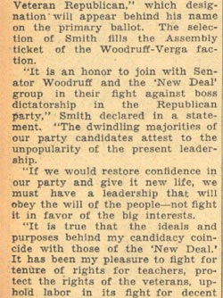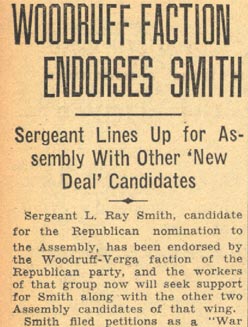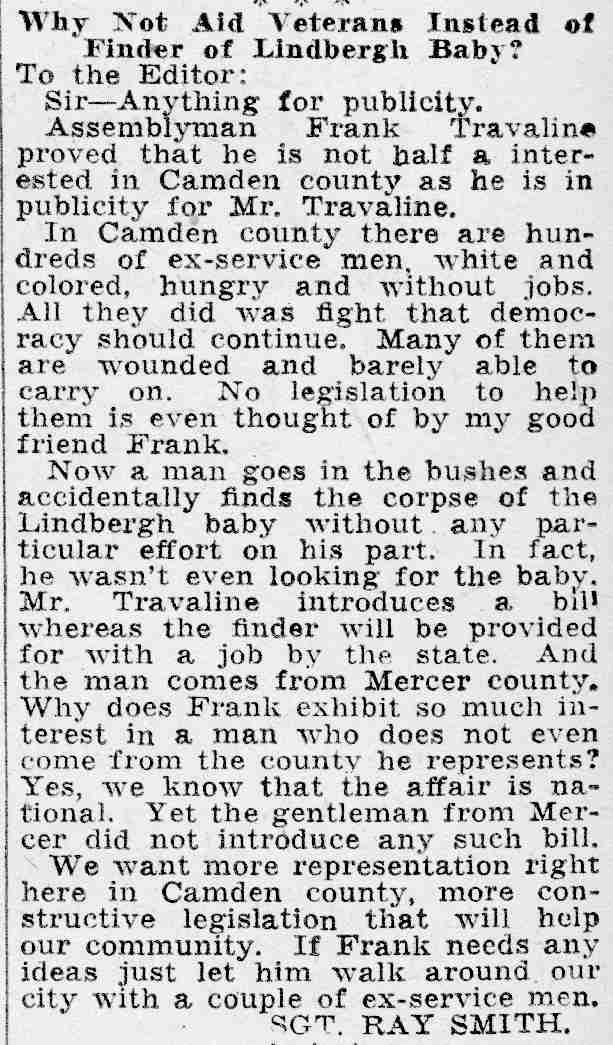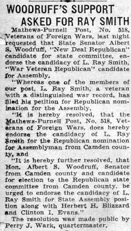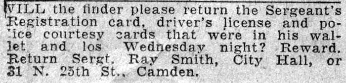 Smith Seeks Nomination For Sheriff Two veteran newspapermen seek the Republican nomination for Sheriff in Camden and Burlington counties at the forthcoming primary election. They are Sergeant Ray Smith, World War hero and Russell M. Stoddard, one of the most popular figures throughout Burlington County. Each is running independently of organization support, but both have friends in every community of their respective counties and their friends believe they can win the nomination and go on to be elected. One of the oddities of the oddities of the situation is the fact that Smith is one of the tallest newspapermen in the state- while Stoddard is shortest news gatherer in the country. The Sergeant is just six feet three and one-half inches high; Stoddard is exactly five feet short. Smith was born in the Sixth Ward, Camden, near Newton Avenue and Spruce streets, 46 years ago. He tips the scales at 260 pounds. Stoddard has lived in Mt. Holly since an infant and weighs 140 pounds despite his lack of height. Smith is married and has a son, Charles A. B. Smith, while Stoddard is a bachelor. Both are extremely active in civic affairs. Smith is chairman of the Camden Elks Krippled Kiddie Committee and devoted much of his time seeing to it that undernourished children receive proper care. Smith was wounded in three major engagements in World War I, and still bears the scars of 14 bullet wounds. Despite this, he later became a leading contender for the heavyweight boxing title. He defeated Bob Martin, for the A.E.F. heavyweight championship. Stoddard is serving his second term as coroner of Burlington County. He was elected both times running as an independent candidate. Throughout the county and most parts of the State, he is known as “Hop” by his friends. The title was bestowed because of his unusual vitality and ability to “hop” about the countryside, He is known in every nook and corner of Burlington County. |