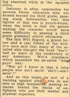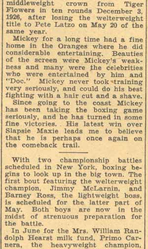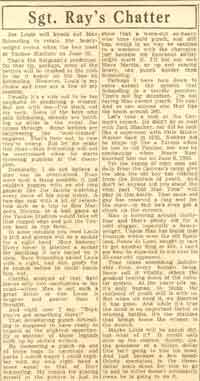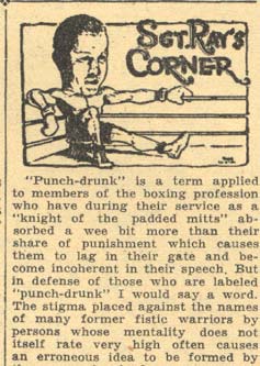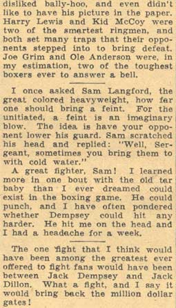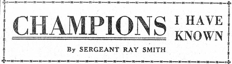 What Do YOU Think? Showing the same grit and determination that carried him through battle-scarred France and then on to heavyweight heights, Sergeant Ray Smith attended the Battle of the Maxies in New York last Thursday … . And with a broken back … The Sergeant had to bribe an attendant in a New York hospital to get his clothes for him so that he could get to the affair … And was there, gritting his teeth to hold back the pain, cheering his old friend Jack Dempsey's initial go as a big-time promoter… |