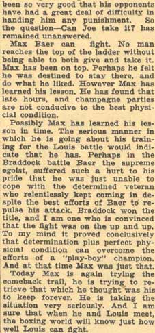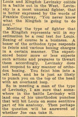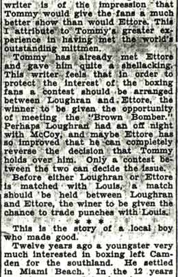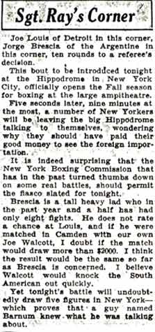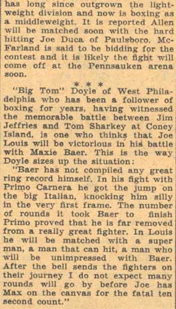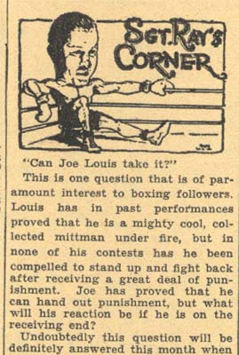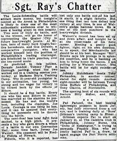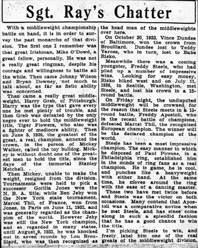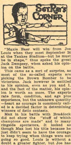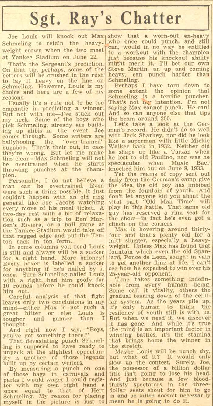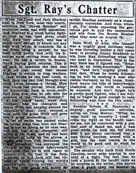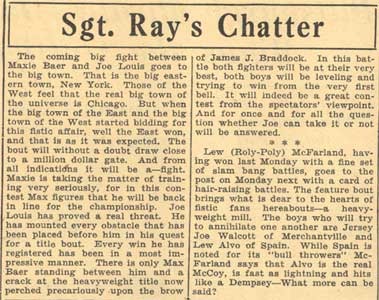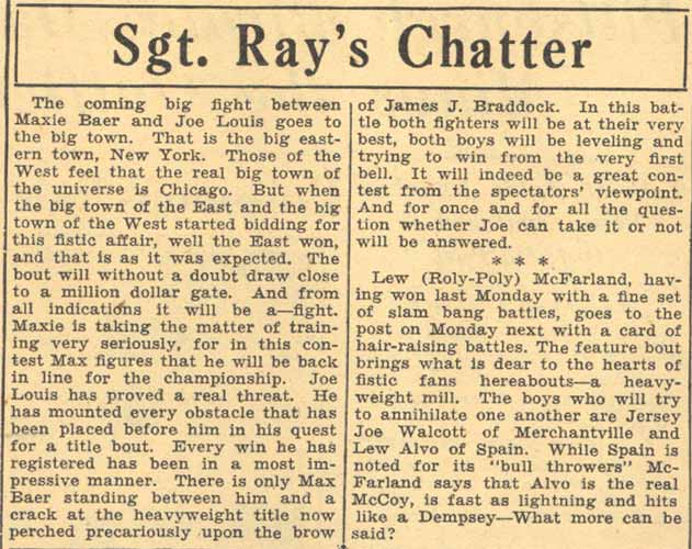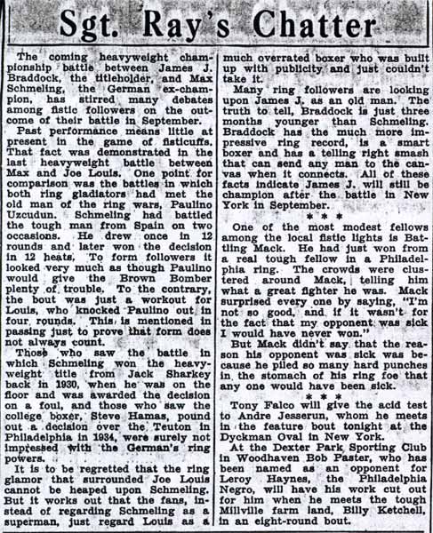 SGT. RAY'S CHATTER A "champ", while it's a name only, must continue to fight in order to keep the golden shekels coming in, but then again he must get right opposition if the spectators are to swarm through the turnstiles. Joe Louis, the 'Brown Bomber," of Detroit, who has slashed through the heavyweight ranks, needs the right opponents if he's to pile the million bucks he thinks he’d like to have as insurance against the vicissitudes of life. The story comes from Newark that Steve Hamas, former Penn State College football star, who for a brief period looked like a real heavyweight prospect, will take the moth balls from his ring clothes, leave his restaurant for a while and retire to the mountains to go through a training period with a shot at Joe Louis at the finish . And so, fight fans, you re m on the present plot being hatched in the inner circle of pugilism: Joe Louis vs. Steve Hamas, some time in June. The ballyhoo has been launched. Soon you will read of the 'stumble bums' Steve has knocked out on his way back for the Louis encounter. You will be amazed at the progress Steve is making in his training quarters, With tales of the sparring partners he knocks bowlegged with a terrific right cross, or maybe with a left hook. All of this you will read daily, for the match is practically in. Steve has been selected to help replenish the exchequer of Louis and, at the same time he won't be doing his own financial standing any harm. But the thing we are interested in is the result of such a battle. It looks to me though Steve will not go more than three rounds, that is provided the former college football order star reaches the best possible physical condition. Last March Max Schmeling who I figure will be duck soup for Louis handed Hamas a terrific beating and knocked him out in the ninth round of a bout in Hamburg, Germany. Never can it be said the writer of this column has aided and abet "big shots" who foisted such one-sided matches on the suspecting public. Remember the Louis-Retzlaff fiasco? That's why I am against this proposed Louis Hamas match, and I'll tell you why. They never come back. The coordination that makes a really great fighter is lost after a long layoff. You never get it back. Like the flower kept alive through hothouse method, it never comes back as the bloom first picked from the bush. The days and months sap something within one, one of the essential qualities that go to make up a great fighter, and that is endurance. It was again proved in the Sharkey-Tony Shucco bout in Boston last Friday night. The former champion looked good in the early rounds, but at the finish he tired and almost sank to the canvas from sheer weariness. The splendid endurance that made him a champion had gone forever Hamas may be young in years but he is old in the fistic game. The beating handed him by Schmeling has in itself taken years from his athletic life. Even at the height of his pugilistic career I doubt he would have been a fit opponent for the 'Brown Bomber'. |