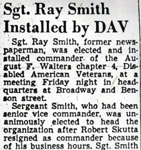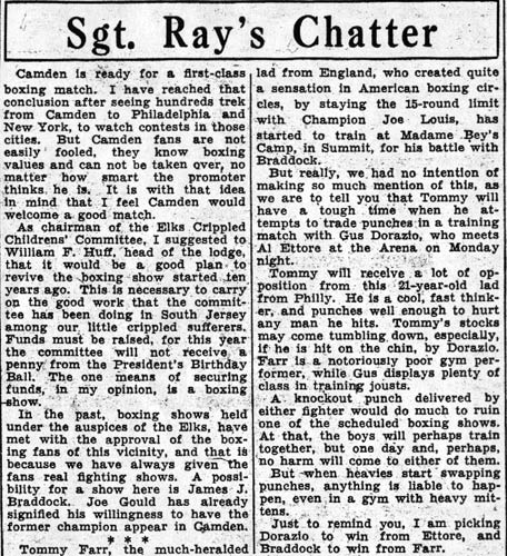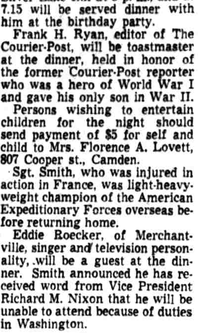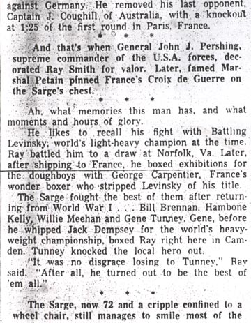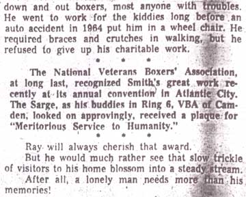 Our Man of the Year " Our guest of honor was born in Camden back on July 6, 1895 as Lucius Raymond Smith … in his 64 years on this earth, the man who is known to thousands over the face of the globe as Sgt. Ray Smith has endeared himself to all in this area for his unselfish interest and aid to crippled children … he has served as president of the Elks Crippled Childrens Committee for more than 20 years … at present, with Assemblymen Francis Werner and Frank Meloni, aided by Steve Kirby and George Ewing, he is fighting for a bonus for World War II Veterans and those who served in Korea. His talk before the N. J. Assembly, two months ago, was a masterpiece . . . he was one of the leaders of the bonus march for World War I Vets and with the aid of Congressman Charles A. Wolverton, established Anacosta … he has served the V. F. W. Post No. 705 four times as commander … he likewise has served three terms as Commander of the Disabled American Veterans - August F. Walters Chapter No. 4 … past commander of the Military Order of the Purple Heart, South Jersey Chapter No. 26 … past president of the Veterans Voting League . . . member of thoirs Post No. 47, American Legion . . . past president of the Gloucester Township Democrat Club . . . past president of the Erial Civic Association. Space will not permit to list any more of the accomplishments of this old soldier . . suffice to say he served his country with distinction in World War I, was decorated, and wounded on three occasions. His only son was killed in Woirld War II. . We, the membership of Ring No. 6 are indeed proud to have our first president as our "Man of the Year" . . . Sgt. Ray Smith . . . fighter for the underprivileged . . . fighter in ring wars . . . fighter on the battlefields of Europe . . . champion of crippled children . . . and so Sarge, your comrades of Ring 6 join with your many friends and say a long and healthy life. "LADIES & GENTLEMEN! HONORED GUESTS! TONIGHTS MAIN EVENT -SGT. RAY SMITH & FRIENDS" . . . the ring announcer would say at a boxing arena. "The feature attraction and testimonial sponsored by the Veteran Boxers Ring No. 6 Commission, Joe (Kid) Murphy, president. The principal, Sgt. Ray Smith, heavyweight boxer years ago, tonight honored as "Man of the Year". To the host of friends Ray needs no introduction, for he has excelled in many fields - sports, charity, newspaper columnist, radio broadcaster, politics, public relations and understanding. In sports, he was an outstanding heavyweight boxer, winning top honors while in the Marine Corps. As a referee in boxing, his ability, good judgment, fair decisions were never questioned. In charitable work he has, on behalf of the Elk's Club, performed a magnificent task for the crippled children. His many good deeds and kind words for his fellow man bestows upon him the title, "Big Man, Big Heart and the Man of the Year". ,