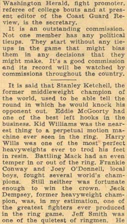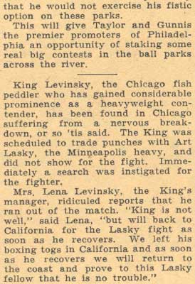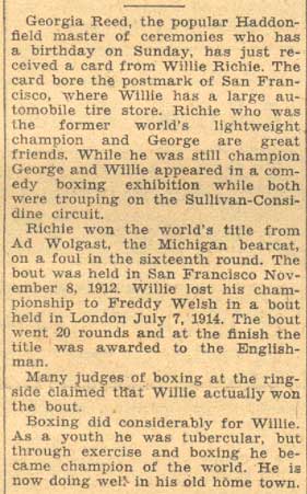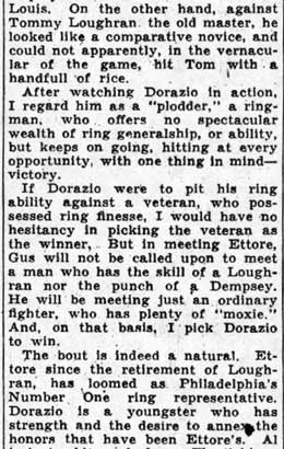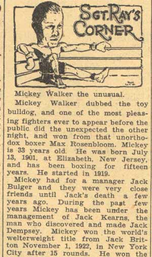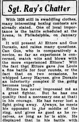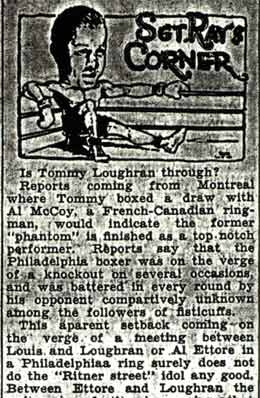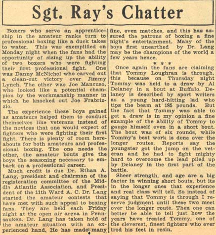 SGT. RAY'S CHATTER Joe Griffo, who referees around these parts, and is now living in Atlantic City where he is a whiskey salesman, still has time to talk on his favorite subject- boxing. "Now about this fight Monday night at the Arena that features Jack McAvoy and Anson Green" said Griffo. "1 never saw McAvoy, but I want to tell you I think he'll get licked when he meets this Pennsylvania colored boy. Green is a tough seasoned fighter and McAvoy will have to live up to all his advance notices if he expects to get by this threat. "I liked your selections of the world's greatest fighters," continued Joe, "but I disagree with you in two cases. I think Harry Greb was a greater fighter than Dillon and I feel that Mickey Walker was the greatest welter who ever drew on a glove. " And as I think over the past, remember the great fights that Mickey has fought, and remember the headaches I suffered in battles with Harry Greb I think Joe is right and so I’ll change my list. The name of Greb supplants Dillon and the name of Walker replaces that of Britton. * * * Shamus Maguire, a really good lightweight eight years back, and for a time looked to be headed for the top is now in the cafe business. Shamus now a real heavyweight is behind the mahogany at the West Jersey Cafe at Third and Market streets. * * * Anson Green might throw a monkey wrench into the lightweight claims of Jack McAvoy. Mac is matched to meet John Henry Lewis for the lightweight title in New York City on March 13. If he loses Monday nights scrap at the arena the chances are that Jimmy Johnston the astute matchmaker of the Garden will cancel the show.. |