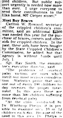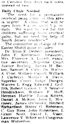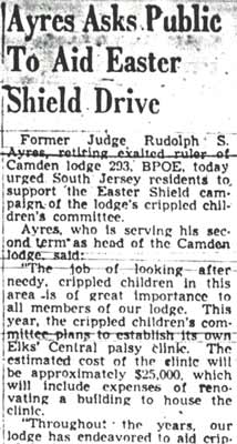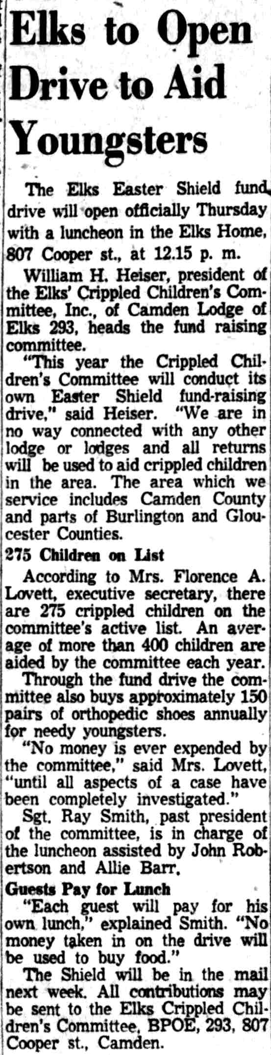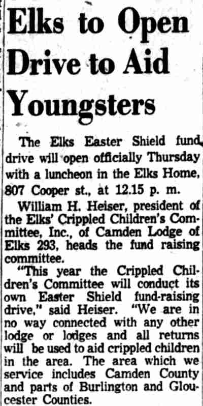 ELKS DISCUSS SEALS FOR CRIPPLED CHILDREN Plans for the sale of Easter Seals campaign to aid crippled children were discussed yesterday at the meeting of the Krippled Kiddies Committee of Camden Lodge of Elks. The committee comprises Sergeant Ray Smith, chairman; Dr. B. Franklin Buzby, Fred Caperoon, Charles Bowen, Miss Mary E. Finley, executive secretary, and Carlton W. Rowand, exalted ruler and ex-officio member. The seals, soon to go on sale, picture a crippled boy sitting at the threshhold of the "Door of Opportunity," waiting for the public to open it wide to him through financial support of the movement. |