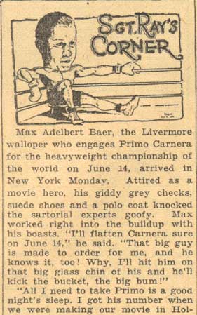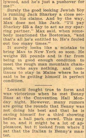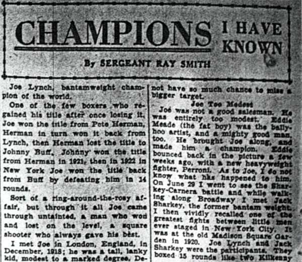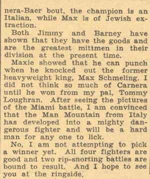 Smith ·Thinks Sharkey Will Win on Square Tonight By SERGEANT RAY SMITH Who will win tonight? Will Sharkey retain the heavyweight crown when he and Primo Carnera. meet at the Madison Square Garden Bowl in Long Island? Or will the gigantic battler from Italy, take the coveted heavyweight title to Europe for the second time in two years? This has been the main topic of conversation along the fistic rialto for the past few days now that the title contest looms so near. The public has lost faith in the so-called experts. The fight fan of today has come to a realization that his opinion or yours is entitled to con just as much consideration as the writers labeled as experts. The sports writers of the country have already started the ballyhoo for Carnera to win. It he doesn't win, the contest and -then it will just be that the experts have pulled another boner, and that's that. When I read what the New York newspapers said of the fight, I reached the decision that I hadn't been to the same fight. So much for experts. Some have already started the cry that the fight is in "the bag," that Sharkey will go in the tank. Somehow this writer thinks this a lot of hooey. It is true that many strange things happen in the fight "racket" in New York. Sharkey Won't 'Bag' It But what ever happens tonight, your informer feels sure that Sharkey will be no party to anything that IS not strictly on the up and up. Sharkey was a "gob," a sailor for Uncle Sam. On his ships around the world, thousands of Sharkey's fellow shipmates will lay every dollar on the line that Boston man wins. · And the writer is willing to bet all the tea in" China. that Sharkey will not sell them out. Logically speaking, Sharkey has well invested all the money he needs. He has a mighty fine family, as the saying goes, he's all set. He is whole-heartedly an American. He proved that when he joined the forces of the U. S. A. for maybe a paltry $18 per month He is an American at heart. When he climbs through those ropes to that he is America's hope to night, we think that two thoughts will be uppermost in his mind. One keep the crown over here; second that the ambling fighter who he will oppose is the same man who was responsible for the death of his pal, Ernie Schaaf. There is no use telling you of his ability. Sharkey licked Schmeling twice, despite the experts' reports to the contrary. Camden Bout Recalled The writer saw both contests. The first battle I was accompanied by one of the best judges of fistic tests around these parts, Tom Ryan. Sharkey had so beaten Schmeling that we were both ready to leave the park, when the low blow giving the world's championship to Schmeling landed. I saw the second fight, too, and Sharkey won by a big margin. One night several months ago, Carnera met a "stumble bum" at the Camden Armory. All who saw it, remember the hard time the "Ambling Alp" had to keep him op the floor. He displayed only one thing, and that, plenty of size. Of course the experts will tell you how he has come along, but you can't fool yourself. He has been on the floor on many occasions, proving that he can be hit. And somehow, when you see a giant as big as Carnera fold up from a punch, you wonder if all these talks about his marvelous ability is just plain "bunk." Sharkey will be fighting not only country of his adoption, but to avenge the death of his pal Ernie and the writer is banking on him to come through a decisive victor tonight. |