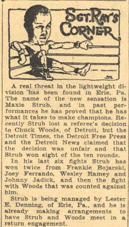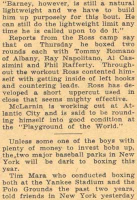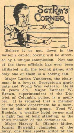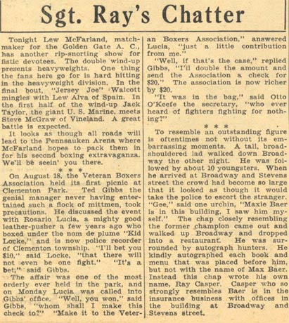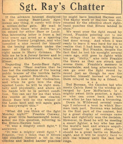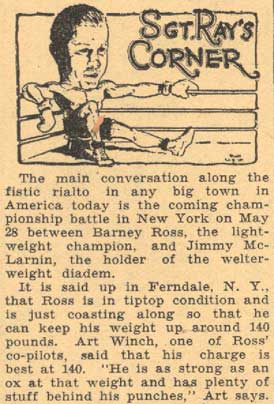 SGT. RAY'S CHATTER I want to tell you of the time I was in Sing Sing as an entertainer in one of the many shows arranged for the inmates of that institution. On June 15, 1920, a boxing show was held within the prison walls for the benefit of the Mutual Welfare League of Sing Sing prison. The show, a boxing carnival, was arranged by Billy Roche, the renowned referee and staged through the courtesy of William A. McCabe, confidential agent for the New York State Prison Department. As I look over the program I see many names who meant much in the world of pugilism 16 years ago. The show was headed by that great colored fighter, Harry Wills. His opponent was the writer of this column. Frankie Burns, the sterling little battler from Jersey City, was matched with Frankie Nelson, of Hoboken. Others to appear on the card were Al Reich, the white hope recently named by Damon Runyon and who attained much publicity as "Jafsie's" bodyguard in the Lindbergh case; Ole Anderson, of Minneapolis; Willie Herman, of Paterson; Willie Gardner, of Paterson; Jimmy Burns, of Bridgeport; Danny Lee, of New York; Jimmy Ambrose, of New York; Georgie Brown, of New York; Phil Bloom. of Brooklyn; Eddie Wallace, of Brooklyn; Red Allen, of Brooklyn; Dave Medal, of New York; Willie Murphy, of Staten Island; Jimmy Duffy, of New York; Fighting Joe Hyland, of New York; Frankie Corry, of New York; Al Turner, of New York; Jimmy Smith, Joe Lynch and Victor Richie. We were entertained at lunch in the large prison dining room, and were greatly impressed with the efficient handling of the many convicts at meal time. Since that June day, 16 years ago, many changes have taken place in the world of fistania. The names that meant so much in those days have disappeared entirely from the sports pages. Harry Wills, I understand, is quite prosperous and living Harlem managing several apartment houses he bought with his ring earnings. Joe Lynch, who rose to win the world's bantam weight championship, is around New York, but I do not know what he is doing. The years have brought many changes, and somehow as I look at the wrinkled program of the affair held 16 years ago I just think what a great thing if all these fellows were assembled again in one group. I'm sure there would be many tales told that would be recorded in boxing history. |