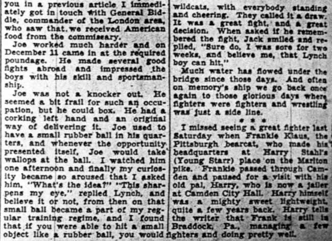 Johnny Kilbane, featherweight champion from Feb. 22, 1912, to June 2, 1923. John Patrick Kilbane, the cagiest boxer who ever drew on a padded mitt. For 11 years Johnny held the coveted title. Scattered throughout his reign as "king" of the feather-weight division are sprinkled the names of the real greats of fistiana. His hair was sprinkled a bit with gray on June 2, 1923, when in the sixth round of a 15-round battle fought in New York he lost to the great little war hero, Eugene Criqui, of France. Johnny had defeated Abe Attell for the title, at Vernon, California, Feb. 22, 1912. "Sure, and boxing is just a means of making a living," Johnny told me one afternoon, after I had asked him why he carried so many boys along. "You see, I don't actually carry them, I just am careful that I don't hit them too hard on a vulnerable spot. These youngsters I box are striving for a place in the pugilistic sun, and are ruined a lot of times if you knock them out. On the other hand, if you help them make a good fight, you season them, develop them, and give the fans greater action for their money. And never forget their money. And never forget that the fellow out there who pays his dollar to see you perform is your boss." What a philosophy! And what action Johnny gave the boys who bought their tickets at the box office! Johnny. was a great crowd pleaser and always gave the fans a run for their money. He was noted for his generosity to his opponents. And a number of the boys who went the limit with John did it because he let them. But let the smart boxer who after Johnny had given him a break suddenly got smart and thought he could win from the "old fox." Johnny would kid them along for a couple of rounds, then, bang would go that right hand loaded with dynamite, and the chances are the "kid" would never hear the referee toll the fatal 10 seconds, but would wake up some time later either in his dressing room or in a hotel, still wondering what it was all about. I remember well the story of Kilbane's fight with Patsy Cline that took place in Philadelphia in 1916. Everywhere in .New York wherever boxing fans would congregate the story would be told as how Patsy got too fresh with the champ and was knocked out. Along in 1916 Patsy Cline" a tough New York boy, loomed as a great fight prospect. He was managed .by George Engle, who landed a match with him with Johnny Kilbane in Philadelphia. The fight was not in the "bag," but it was sort of understood that Johnny was not going to make any particular effort to knock off Cline. The fight went through the first round in good shape and Johnny was heard to say to Patsy, "You're doing great; now behave yourself and everything will be O. K." But the bout was only scheduled for six rounds and Patsy had ideas of his own. Starting the second round; Cline tried his hardest to clip the wily Kilbane. That was the payoff. A few hours later, Patsy awoke. The club was in darkness, only Patsy's manager and a handler (waiting for his dough) were left in his dressing room. As Patsy moved, the manager exclaimed, "Geez, we was just going to send you to the hospital. We thought you were dead." Patsy told me years later that Kilbane had not knocked him out in that bout, but that someone had sneaked up behind him and hit him with a club. One day in New York Johnny told me, "You know, I like that town I across the river from the burg where you live. That six-round business is the money. Sure, and you have to work hard and fast but when you only have six rounds to go there's nothing to it." 'Some of Johnny's best fights were fought In Philadelphia. It was in Philly in 1917 that he was knocked out by Benny Leonard in three rounds at the Olympia Club. Many of you, shall I say, "old timers," remember that show, for it was responsible in a way for starting the all-star show. Edwards had signed Kilbane and Leonard for his feature bout, at the Olympia. The late Jack McGuigan had put on an all-star show at his National Club, featuring some of the greatest stars in the business at that time. Benny and Johnny drew a capacity house. It was something of a novelty to see two champs at that time. Johnny was a great little fellow, and Bennie was a great bigger fellow, and the law of averages must be that always a good big man will whip a good little man. It was true on that day. It was a sort of the setting of the sun for Kilbane. He made a few good fights after that K.O. defeat, but he had passed the zenith of his career. Johnny engaged in 139 bouts. He knocked out 23 of his opponents, engaged in 76 no-decision contests, won 25 battles, lost two, took part in two affairs that were called no contests, and was knocked out twice- once by Leonard and the other time by Criqui. Surely a great record, when you see sprinkled over Johnny's past such names as Abe Attell, Eddie O'Keefe, Young Saylor, Biz Mackie, Eddie Moy, Frankie Burns, Tommy O'Toole, Eddie Morgan, Packey Hommey, Ralph Brady, Richie Mitchell-the list would cover a cou-ple of more sheets of paper. Johnny was a real king of all he surveyed in the featherweight division when he was champion. He met them all, and beat them. That is, all but once, when he had a very close call, It was in 1913, and he fought that great Italian. Jumping Jack Johnny Dundee. It went 20 rounds, and was called a draw. Dun-dee was managed by my old man-ager, "Scotty" Monteith. Just be-fore the fight, Johnny-- But that is another story, and I'll tell you about it when I write about another great champion, Johnny Dundee, next Tuesday. |