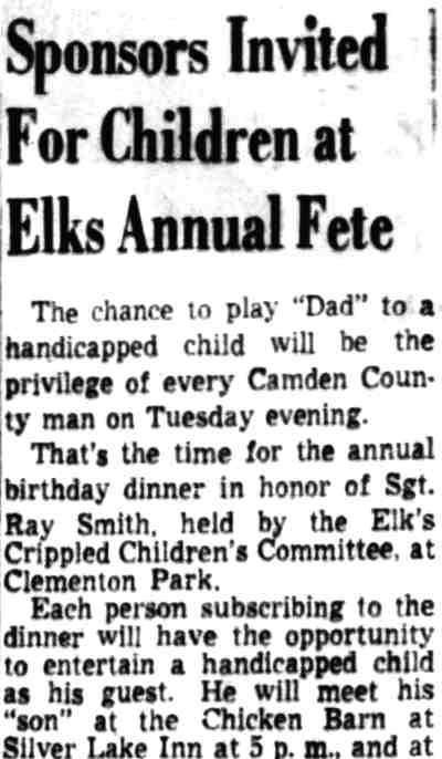 41st Annual Affair Crippled Children’s Party Tomorrow The Crippled Children’s Committee of Camden Elks Lodge 293 will sponsor its 41st annual party for crippled children tomorrow. S.S. Norcross 3rd, exalted ruler of the lodge, and Edward J. Griffith, president of the Crippled Children’s Committee, said the children will board buses at 10:30 AM at the Elks' home, 807 Cooper Street. First stop will be Sergeant Ray Smith's home on Lake Renee, where the, children will have their annual picnic lunch. Following lunch they will ride horses from the Persian Acres Dude Ranch operated by County Detective Robert Di Persia. Erial Fire Company will pick up the children for a ride to the Nike Missile Base in Erial, then onto Clementon Lake Park. Following dinner in the Chick Barn at Silver Lake Inn, the youngsters will return to the Elks' Home. Among those helping Sgt. Ray celebrate his 72nd birthday at Silver Lake Inn later in the evening will be former Judge Samuel P. Orlando, Congressman John E. Hunt, Jersey Joe Walcott, Mayor Alfred Pierce and state Senator Frederick J. Scholz and recently appointed Prosecutor A. Donald Bigley. |