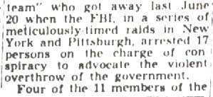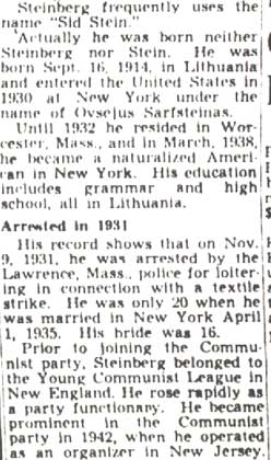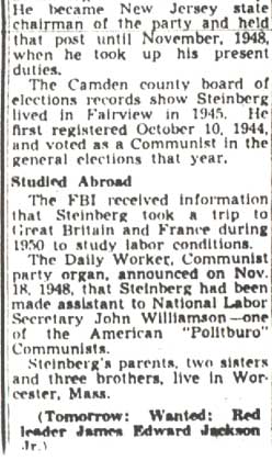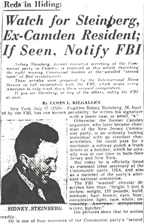 SIDNEY STEINBERG came to the United States from the Utena, Lithuania in 1930, with his brother Murray. He was a devout Jewish young man who studied the Talmud. His papers stated that he was 16 and a Lithuanian named Ovsejus Sarfsteinas. The Steinberg family eventually settled in Massachusetts near Worcester. Shortly after his arrival in the USA he got a job working for a man named Ostrow who was a communist. Ostrow made a great impression on the 16 year-old youth, who knew nothing about Democracy and believed that what Ostrow taught him about Communism was the way of his "New Country". Sidney Steinberg became involved with the Young Communists League of New England. He was arrested in 1931 in Lowell MA in connection with a textile strike, and moved to New York in 1932. He became prominent in the Communist Party in 1942,and was the New Jersey chairman of that party form 1942 through November of 1948, when he took a post with the national Communist Party. Sidney Steinberg moved to Camden in the mid 1940s. He registered to vote on October 10, 1944 and was living in Fairview in 1945. He does not appear in the Camden city directory in 1947. After World War II, as relations between the Soviet Union and the United States and her allies broke down, tolerance for political dissent and labor activism plummeted, perhaps in equal measure due to "yellow" journalism (see the example below) and to the activities of Soviet espionage agents, especially in the case of the theft of nuclear weapons related technology. Life became increasingly difficult not only for the politically active but for people in the labor movement such as Camden native John Tisa and for those indirectly connected, the best known example being the blacklisting of people in the movie industry during this time. In 1951 Sidney Steinberg was indicted in 1951 for conspiracy to overthrow the government of the United States. Although he did not immediately submit to arrest by the FBI, as best that I can determine these charges did not hold water. His interest in the Communist Party was apparently more from his pro-labor leanings than any interest in changing our form of government to that of Stalin's Russia. |
