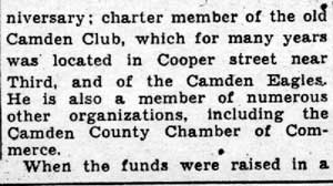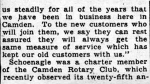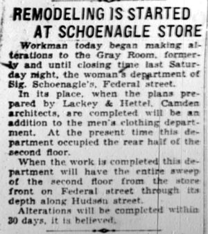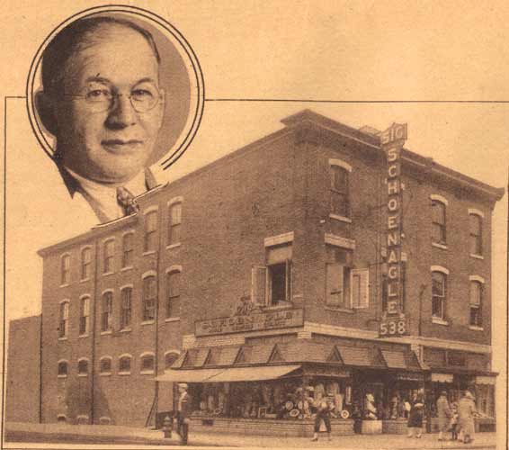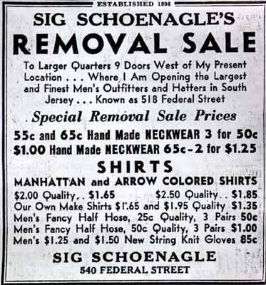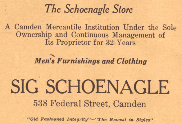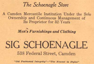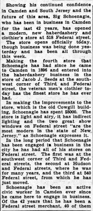 SIGMUND "SIG" SCHOENAGLE was born in Vienna, Austria around 1875. He came to America as a young man, and settled in Camden NJ. In 1894 he established a haberdashery at the southwest corner of 3rd and Federal Streets. He then moved to 538 Federal Street, the corner of Hudson Street and Federal Street, where he conducted business for many years. He also became active in the political and civic life of Camden. In December of 1904 Sig Schoenagle was a founder and trustee of the Merchants Republican League along with fellow Camden businessmen Joseph H. Pfeiffer, Nathan Fuhrman, Jacob Z. Blank, Louis Cades, and William Fox. The League had its offices at 808 Broadway. Sigmund Schoenagle had been an investor in the Camden Basketball Association, the parent company of the Camden Electrics in the National Basketball Association, the first professional basketball league. In June of 1905 he sued William "Billy" Morgenweck, who had organized and coached the team. Sig Schoenagle was then involved in promoting bowling in Camden. In February of 1906 Sig Schoenagle took a trip to visit Washington DC, the purpose of which is not known at this time. Sig Schoenagle was a charter member of the Rotary Club of Camden. The first regular monthly dinner meeting was held on January 7, 1913, at the Hotel Ridgeway in Camden. In the early 1920s Sig Schoenagle and his brother William Schoenagle were active participants in the Community Hotel fund raising drive that culminated in the erection of the Walt Whitman Hotel. He placed the advertisement below in the Camden Courier-Post special edition commemorating the opening of the Delaware River Bridge. By 1927 he had a building erected at 544-546 Federal Street. Designed by the Camden architectural firm of Lackey & Hettel, the building was known, appropriately enough, as the Schoenagle building. Sig Schoenagle apparently never operated a shop in this building, which was for many years home to the W.T. Grant department store. This building was demolished in the summer of 2003. In 1928 he again employed Lackey & Hettel in the design of alterations to his retail establishment. Sig Schoenagle was still living and working at 538 Federal Street at the time of the 1930 Census. He moved to 540 Federal Street in 1932, and in early 1938 moved his business once again, this time to 518 Federal Street. Tragically, Sig Schoenagle took his own life in May of 1940, when he was found hanging in his store at 518 Federal Street. He had been living at 2118 Spring Garden Street in Philadelphia at the time of his death. The business and building at 518 Federal Street operated as Kline and Gallimore through 1950, and was known as Brait's Men's Store in 1959. Sig Schoenagle's brother, William Schoenagle was in business in Camden for many years, manufacturing store curtains and valances. William Schoenagle passed away in January of 1950. |