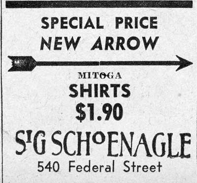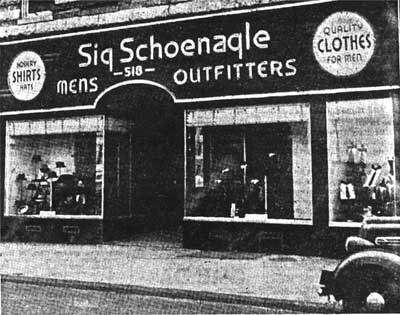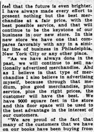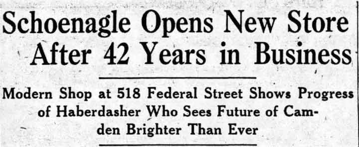 Photo above shows the new haberdashery and clothing store of Sig Schoenagle at 518 Federal Street, which opened officially yesterday. Schoenagle, who has been in business in Camden for 42 years, all of the business years spent on Federal Street, is shown on the right. "I believe in the future of Camden and South jersey just as much today as when I first came to Camden." observed the veteran merchant and civic worker, who has been in the forefront of every movement designed to help Camden and South jersey. "In fact, I feel that the future is even brighter," he added. The new store, which compares favorably with any store in any larger city, has 9000 square feet of floor space. |