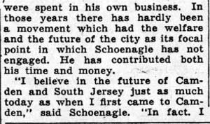 community effort for the erection of the Hotel Walt Whitman 14 years ago, Schoenagle took a leading part. |