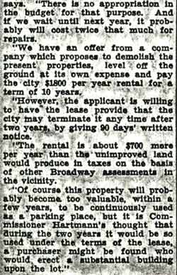 Lot Commissioner Frank J. Hartmann almost daily is called upon to solve bewildering problems in his job of directing the 16 bureaus that make up the city Department of Public Works. The almost over-night disappearance of six dilapidated houses left him somewhat perplexed, but yesterday another vexing matter was put to him for an official decision. Hartmann must decide whether he will approve and seek the double approval of his colleagues in the City Commission on a matter of establishing a hamburger restaurant on the east end of the present commercial auto parking lot bounded by Federal, arch, Fifth and Hudson streets. Monroe Y. Brett, present leaseholder of the parking tract, notified Hartmann he will vacate the premises next Monday because the parking business proved a losing venture, due to the rent of $441 a month. Hamburger to Rescue However, Brett seized upon an idea that will permit him to continue occupancy. He passed the offer along to City Assessor S. Raymond Dobbs, acting supervisor of city property. Brett wants the privilege of building and operating a hamburger restaurant, and if given that privilege he is willing to sign for a longer lease. Dobbs put the matter up to Hartmann with the result Walter S. Anderson, an attorney and assistant to Hartmann, was called into a conference to debate the matter.