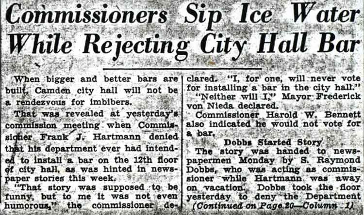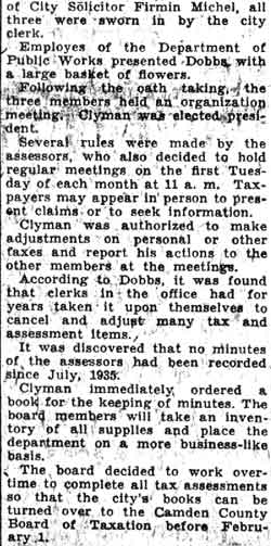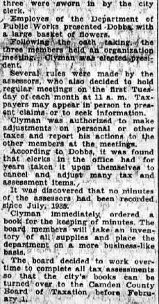 IS GIVEN $4000 JOB OVER HOT PROTEST BY ‘REBEL’ IN G.O.P. Joseph H. Van Meter, insurgent Republican freeholder from Collingswood, today declared that David Baird Jr., Republican leader, had admitted that Theodore Kausel was “not the man for the job” to which he was appointed by the Board of Freeholders yesterday. Baird told him, however, said Van Meter, that a promise had been made “to take care of” Kausel because of the latter’s aid to the Republican Organization at the last municipal election. Van Meter quotes Baird as follows: “I’ll admit that Kausel is not the man for the job. But you have to help me out because we promised to take care of Kausel when he came over to us in the city election. And it was through Kausel that we got Hitchner and a lot of his crowd.” “We’ve got ourselves tied up with him. We’ve got to take him, and I want you to go along, and help me out”. “I know his business record and I know his political record. I know the freeholders don’t want him and our conference don’t want him, but we’ve got to eat crow, and I want you to help me out” Under the watchful eyes of organization leaders, Republican members of the Camden County Board of Freeholders yesterday took care of Theodore “Teddy” Kausel. With David Baird Jr. and other chieftains of the party occupying front row seats, the board created the post of “general manager of county institutions and promptly named Kausel for the job at an annual salary of $4,000. Like ghosts at a feast, Baird and the other party leaders sat silently at the freeholders reorganization meeting. Like actors in a carefully pre-arranged play, a little uncertain of their cues, 20 Republican freeholders cast furtive eyes at the group of spectators. They said no word, these freeholders. They made no reply when Joseph H. Van Meter, of Collingswood, breaking from their ranks, declared that 20 of them had told him that Kausel was unfit for the position to which he was being appointed. They listened in uncomfortable silence while Van Meter gave voice to a scathing denunciation of their “lack of backbone” and while a running fire of sarcasm from Democratic members fell upon their ears. Scene Was Drama The scene was drama. It might have been a revised performance of “Uncle Tom’s Cabin” with 28 furtive-eyed Uncle Toms and an impregnable line of Simon Legrees, cracking invisible whips in threatening gestures. And the scene was also comedy. For of that score of men who, according to Van Meter, had agreed that Kausel was unfit for the job but “had to be taken care of,” none arose to protest against the action. Within their Hearts the chorus of Uncle Toms may have been saying. The county may own out bodies, but our souls belong to the Republican Organization.” But if they thought this, they said no word. Today it was pointed out that it will not be long before freeholders come up for renomination at the primaries. Today, it was also predicted that Van Meter has signed his political death warrant so far as the Republican organization was concerned. But at least he received the ungrudging tribute of the Democratic minority on the board, who joyfully proclaimed that they had found “at last a Republican with guts.” Van Meter Fights Hard Van Meter spared no words, took no half-measures. He accused his fellow Republican members of coercion, double- dealing and weakness. He fought the appointment bitterly. He raked up the vocational school matter, in which $85,000 had been paid for the school site on Kausel’s recommendation, a price later declared to be exorbitant. Democratic members joined the Collingswood insurgent. They charges that the $4,000 appointment was the price of Kausel’s allegiance to the Republican party. They declared that he wasn’t worth it. They recalled, later, that Kausel had shifted from the Republican Organization to the Non-Partisan movement and then back again after being one of the loudest to criticize the Organization. They asserted that after his removal as chairman of the vocational school board, he had sought the appointment as city purchasing agent. They avowed that the Republican City Commissioners had ‘refused to handle Kausel” and had “wished him off on the county.” The 26 other Republican freeholders- all of those present, excepting only Van Meter- continued to listen in silence. And when the vote came, every one of the 26 voted for the creation of the position of “general manager of county institutions” and for the appointment of Kausel. A little later the reprisals upon Van Meter began. He was removed from the central plant and county farm committees of the board, shifted to the elections committee and allowed to remain on the printing and agricultural committees, regarded as unimportant groups. Reprisal Were Threatened. “It doesn’t surprise me,” he said. “I was threatened with it. They told me they’d ruin me. But I couldn’t go back to Collingswood and ask the people to vote for me again if I hadn’t fought against this appointment.” The defection of Van Meter came apparently as a surprise. The meeting had opened with the passage of the county budget on the first reading, the selection of Leslie H. Ewing, of Berlin, as director of the board, the calling of Frank P. Moles, of the Third Ward to be sworn in and his failure to respond or to appear for the gathering. Minor matters had been attended to and then Fred W. George, clerk of the board, rose to his feet and began the task of reading a long list of proposed amendments to the rules. Buried far down in the list of revisions was that which, “for purposes of economy”, sought to place all county institutions under a central head to be known as general manager. George lost his breath before he had more than half completed the lost of amendments, and George Rothermel, pinch-hitting for Walter Keown as counsel for the board, took his place. Then Director Ewing called for a vote. Schor