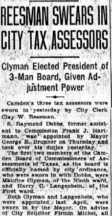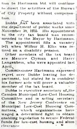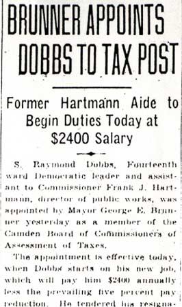 S. RAYMOND DOBBS was born Samuel Raymond Dobbs on October 28, 1894 to Samuel B. and Emily A. Dobbs. He was the oldest of the three Dobbs children, coming before sisters Emily and Edna. The elder Dobbs was in the brick business, and had done well for himself, by 1920 owning a home at 201 Westmont Avenue in Haddonfield NJ and employing a live-in servant. At the time of the 1920 census, S. Raymond Dobbs was working as a clerk in the brick business. He had previously served with the American Armed Forces in World War I, and is named among those who served from Haddonfield at World War I Memorial and Monument in that borough. During the 1920s S. Raymond Dobbs got involved in the real estate business. He moved to Fairview, and served as the secretary of the Kearsarge Building & Loan Association during the mid- and late- 1920s. After his move to Camden S. Raymond Dobbs became involved in politics, as a Democratic from the 14th Ward of Camden. He served during the mid-1930s as the executive secretary of the Camden Municipal Low-Cost Housing Committee, which was the governmental body that successfully arranged for the financing and eventual construction of Westfield Acres, Camden's first public housing project. He also returned to school during this period, and was a member of the 1932 Class of the South Jersey Law School in Camden. S. Raymond Dobbs was first hired by the City of Camden on November 30, 1935, when he took a position in the Department of Public Works as an assistant to City Commissioner and Director of Public Work Frank J. Hartmann Jr. On January 20, 1938, he was appointed to the Camden Board of Commissioners of Assessment and Taxes, later renamed the Board of Assessors. He was still serving in this capacity as late as 1947. After leaving government, S. Raymond Dobbs went into real estate, maintaining an office in his home at 2957 Yorkship Square in the Fairview section of Camden as late as 1970. He passed away in November of 1972. |