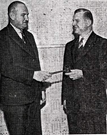 Freeholder Stanley Ciechanowski, retiring president of the Camden Polish American Citizen's Club, is shown above presenting the gavel to Stanley Jaskolski, the new president, at the annual dinner held last night in St. Joseph's Parish Hall. |