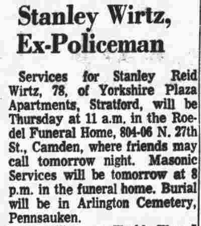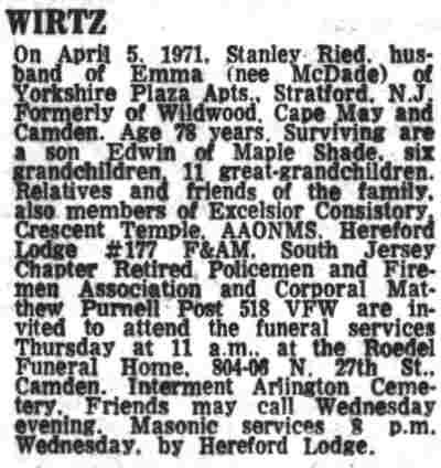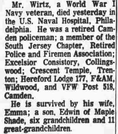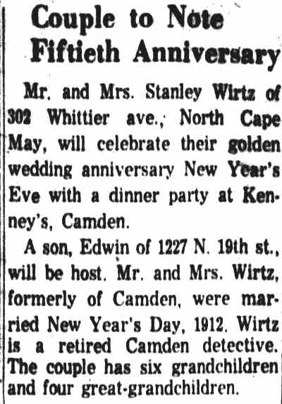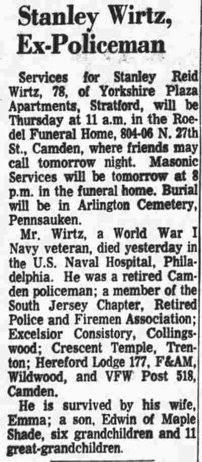 compiled, Stanley Wirtz was appointed to the Camden Police Department. The 1926 Directory By 1930 Stanley Wirtz was living at 1339 Van Hook Street. Also living there was his wife, the former Emma MacDade, son Edwin Wirtz, his mother-in-law, and his father. By 1933 he was assigned to the traffic department as an accident investigator. He had moved to 1197 Thurman Street by the spring of 1936. The 1940 Census shows Stanley Wirtz, wife Emma, and son Edwin at 725 Morgan street. Stanley Wirtz was still with the Camden Police Department as late as the spring of 1942. The family was then living at 1092 New Merrimac Road. He retired from the Police Department shortly afterwards. Stanley Wirtz was living at 527 Fairview Street, not far from the New York Shipbuilding Corporation shipyards, when the 1943 and 1947 Camden City Directories were compiled. In October of 1943 Stanley Wirtz's so, Edwin Stanley Wirtz, was appointed to the Camden Fire Department. Stanley Wirtz's nephew, Carl. M. Wirtz joined the Camden Fire Department in 1951. By September of 1950 he was working as a bartender. Stanley and Emma Wirtz were living in North Cape May, New Jersey in 1962 when they celebrated their 50th wedding anniversary. They were living in Stratford NJ by the fall of 1970. , and passed away on April 5 of the following year. |