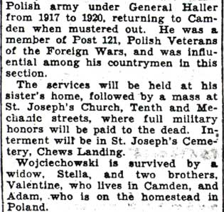 STANLEY WOJCIECHOWSKI was born in Poland around 1888. He came to America, but remained committed to his Polish heritage, In 1917 he went to Niagara Lake, Canada, and enlisted in the Polish Army then training there. He went overseas, and served under General Haller until 1920. After Stanley Wojciechowski returned to Camden, he became a member of The Polish Veterans of Foreign Wars, Post 121. He also became involved in the bar business as an owner, becoming the proprietor of the Rosemont Cafe at 2051 Arlington Street in Camden's Eighth Ward. He remained owner of the bar until he passed away Stanley Wojciechowski died away in October of 1936 at 1215 Decatur Street, the home of his sister, Mrs. Mary Lisowski. After funeral services at St. Joseph's Church, he was buried at St. Joseph's Cemetery at Chews Landing in Gloucester Township NJ. |