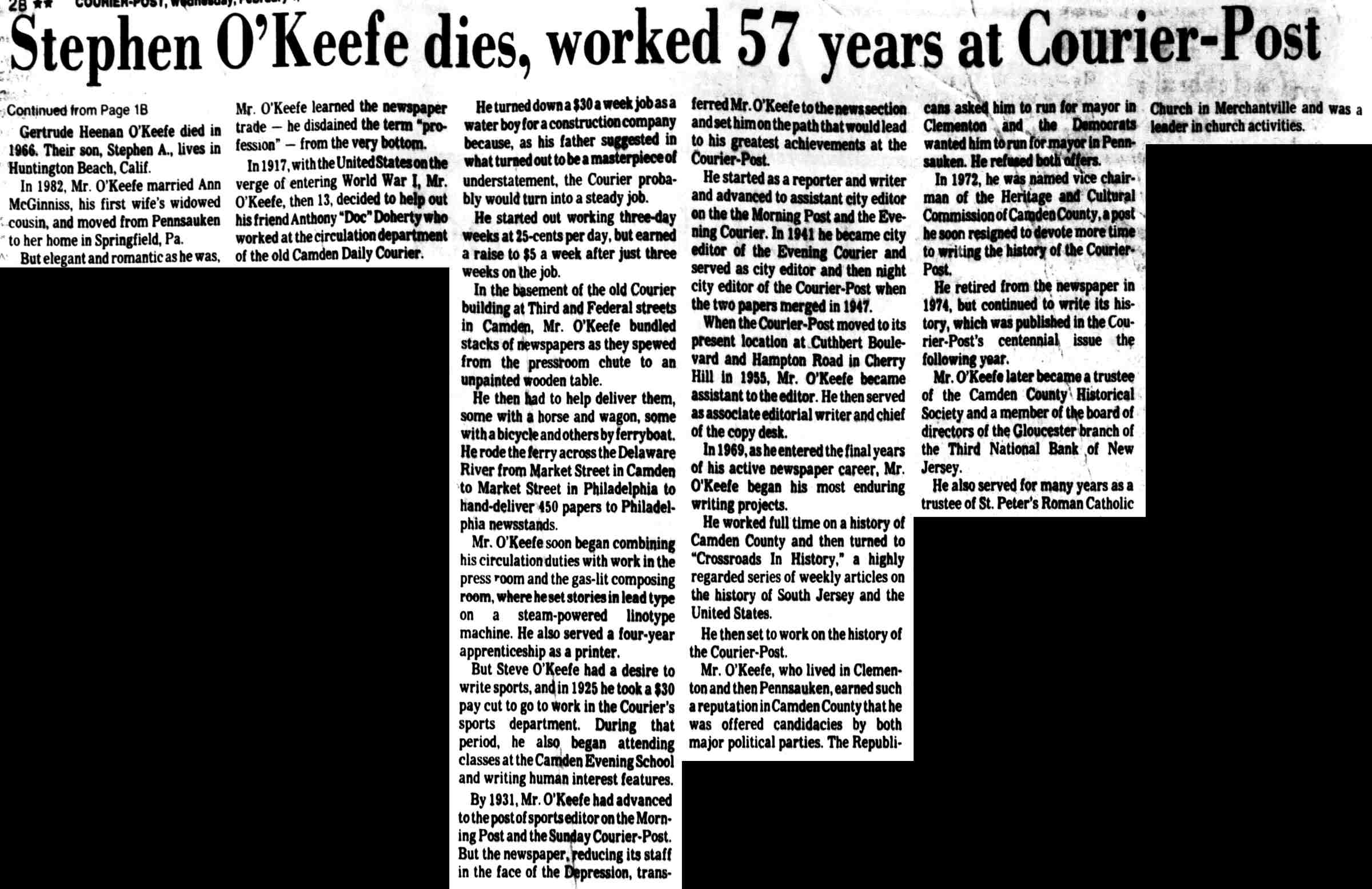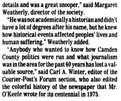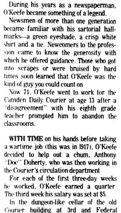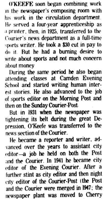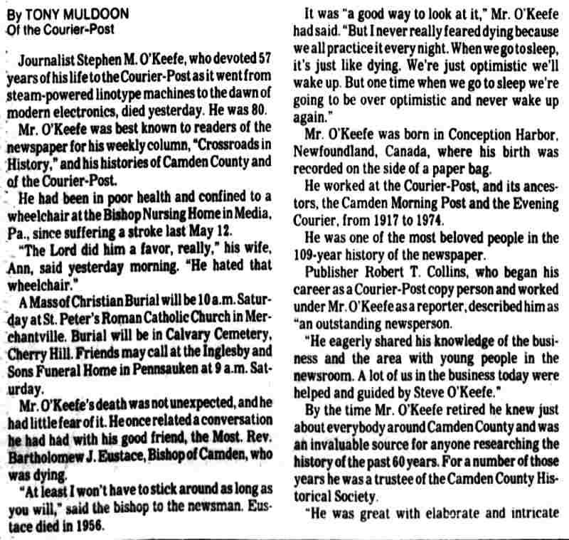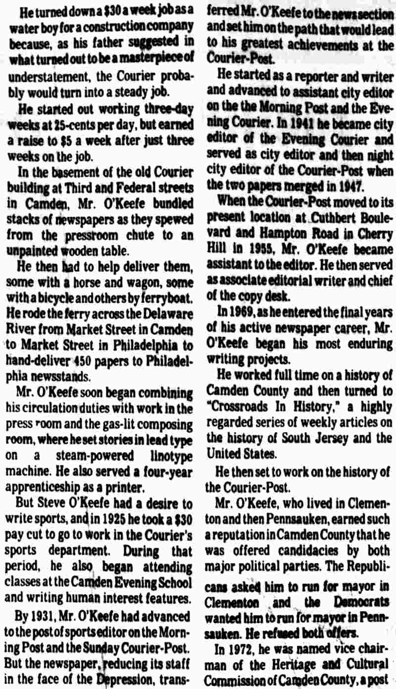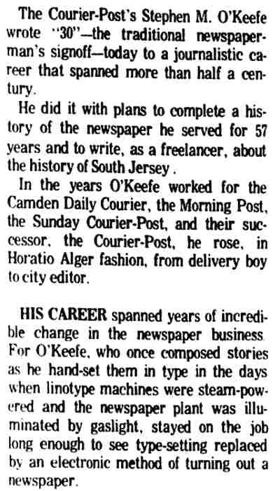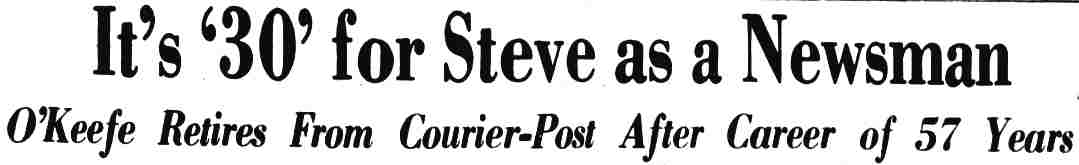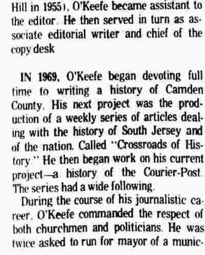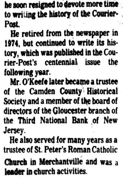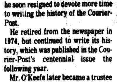 STEPHEN M. O'KEEFE had a fifty-seven year career in journalism. entirely with Courier-Post. During the last five years of his career he wrote an weekly column called "Crossroads in History", which you can find below. Stephen O'Keefe's last work as a journalist was published a year after his retirement, a seven part History of the Courier Post, as part of the newspaper's one-hundredth anniversary issue. Stephen M. O'Keefe passed away on January 31, 1984. |