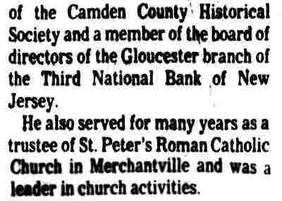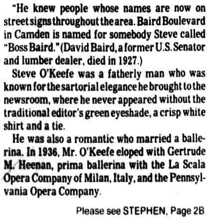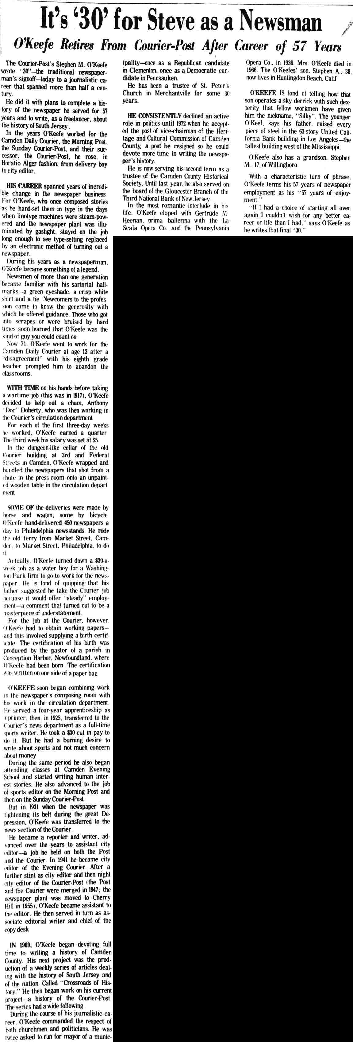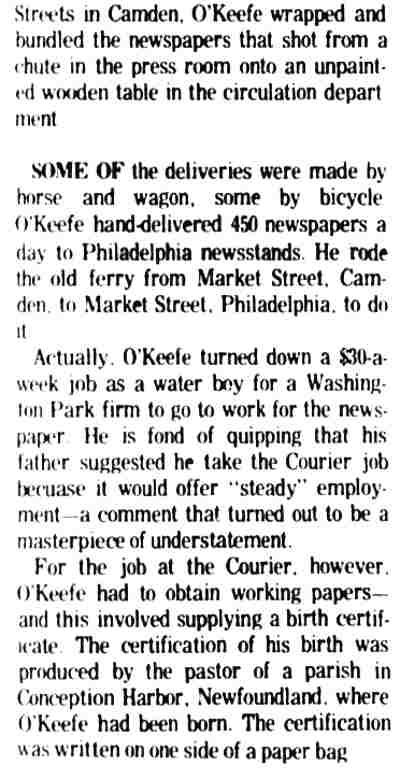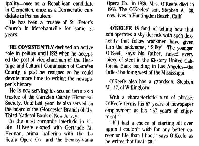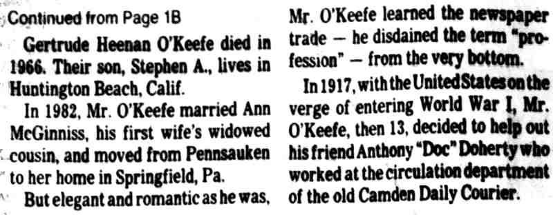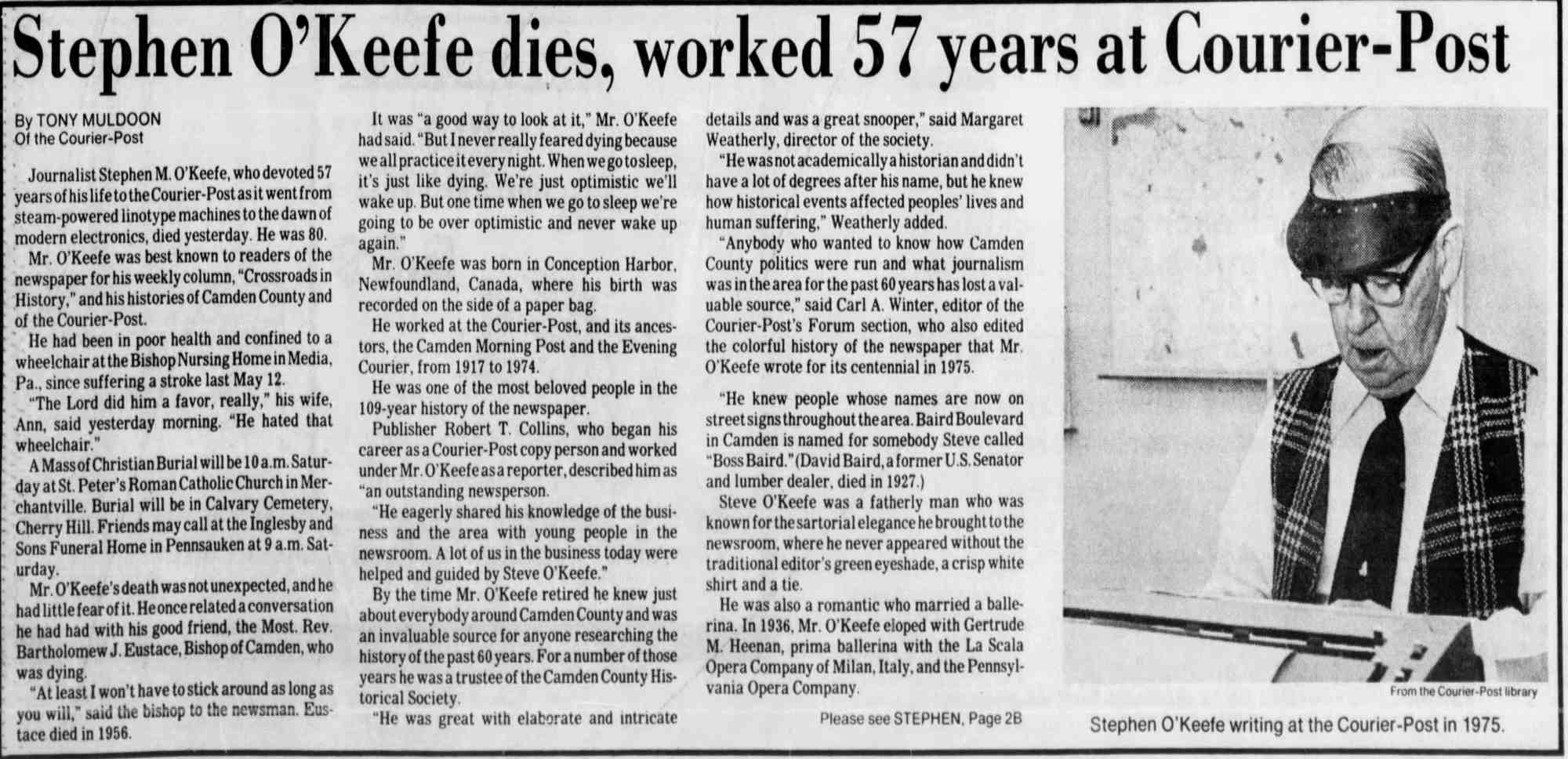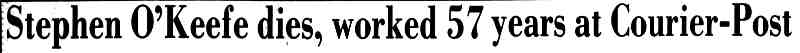 STEPHEN M. O'KEEFE had a fifty-seven year career in journalism. entirely with Courier-Post. During the last five years of his career he wrote an weekly column called "Crossroads in History", which you can find below. Stephen O'Keefe's last work as a journalist was published a year after his retirement, a seven part History of the Courier Post, as part of the newspaper's one-hundredth anniversary issue. Stephen M. O'Keefe passed away on January 31, 1984. |