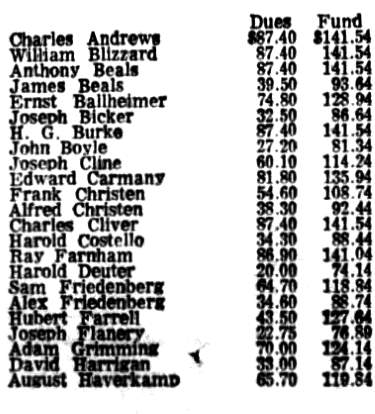 Anthony Beals James Beals Ernst Ballheimer Joseph Bicker H.G. Burke John Boyle Joseph Cline Edward Carmany Frank Christen Alfred Christen Charles Cliver Harold Costello Ray Farnham Harold Deuter Sam Friedenberg Alex Friedenberg Hubert Farrell Joseph Flannery Adam Grimming David Harrigan August Haverkamp |