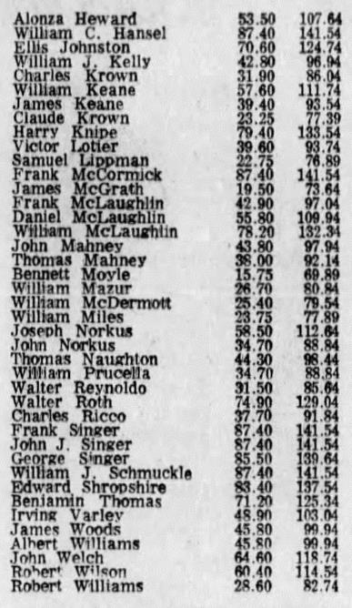 Howard William C. Hansel Ellis Johnston William J. Kelly Charles Krown - William Keane James Keane - Claude Krown Harry Knipe Victor Lotier Samuel Lippman Frank McCormick James McGrath Frank McLaughlin - Daniel McLaughlin William McLaughlin John Mahney Thomas Mahney William Mazur William McDermott William Miles Joseph Norkus - John Norkus Thomas Naughton William Prucella Walter Reynoldo Walter Roth Charles Ricco Frank Singer - John J. Singer George Singer William J. Schmuckle Edward Shropshire Benjamin Thomas Irving Varley James Woods Albert Williams - John Welch Robert Wilson - Robert Williams |