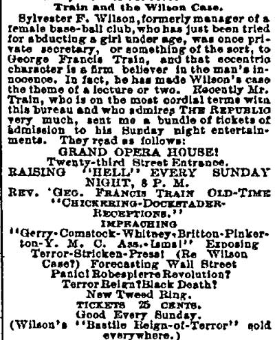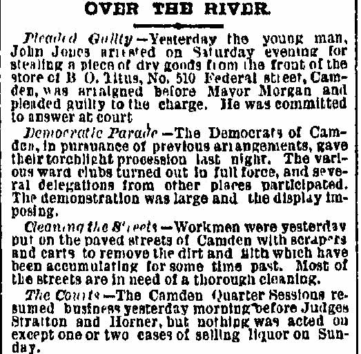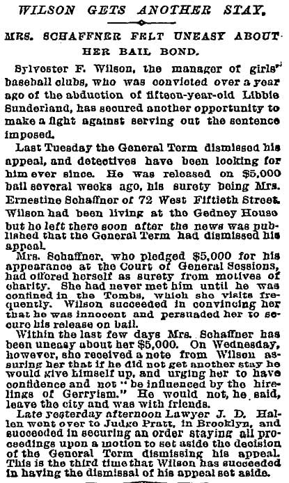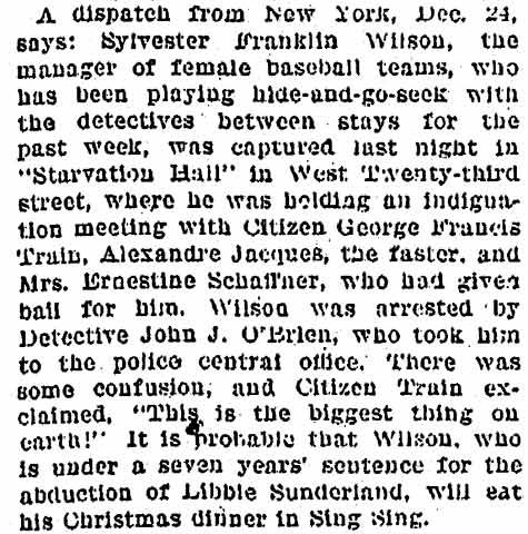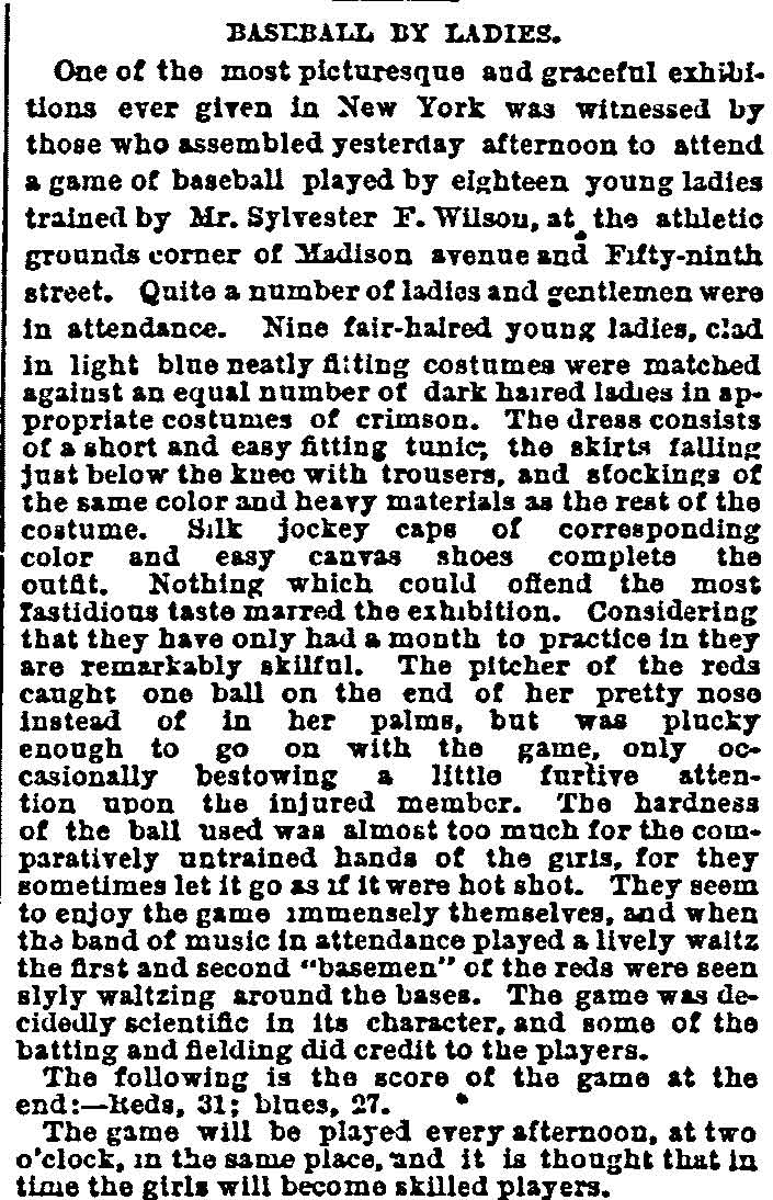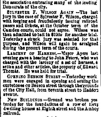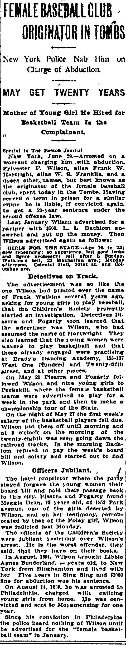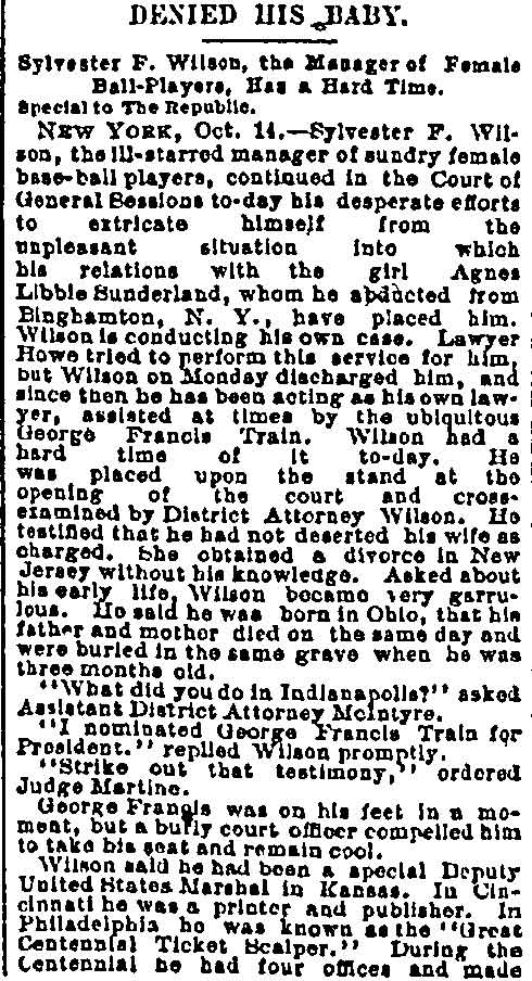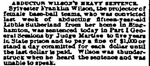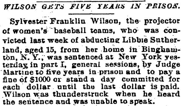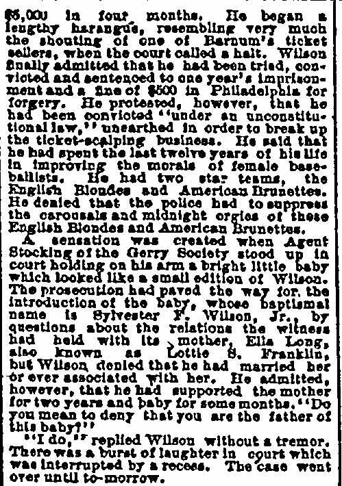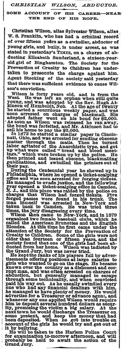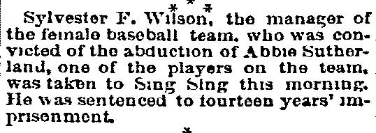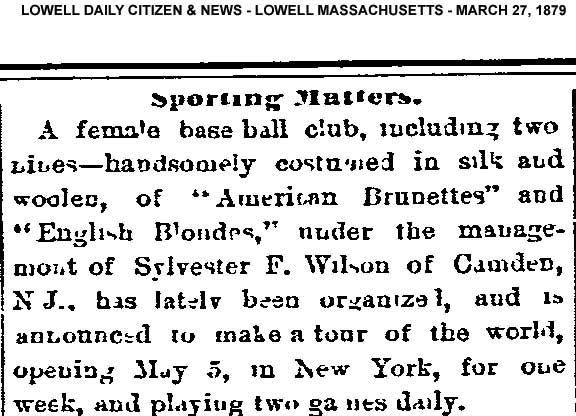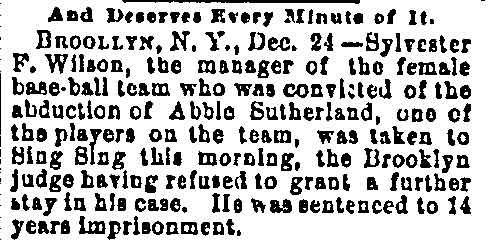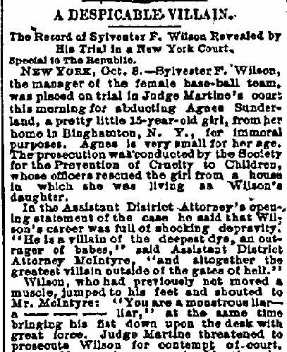SYLVESTER F. WILSON was, when it all comes down to it, not a very nice person. In Camden he made the newspapers in the 1870s for assault and battery, ticket scalping (which involved a certain amount of forgery and counterfeiting), and I'm sure is I spent more time in local newspapers I would find more transgressions. Not long after he wore out his welcome in Camden, Sylvester Wilson began promoting all-girl baseball teams… the "English Blondes" and the "American Brunettes". In time he ran afoul of the law, as at least two of the girls were underage. He also appears to have had a habit of skipping out on paying bills. Sylvester Wilson served time in the New York penal system in the 1890s for his activities, and apparently was still up to his old tricks as late as 1903. In his time, Sylvester Wilson generated a lot of newspaper articles, which I think you will find to be an interesting look into days gone by. If you know more about Sylvester F. Wilson, please contact me by e-mail August 5, 2009 |